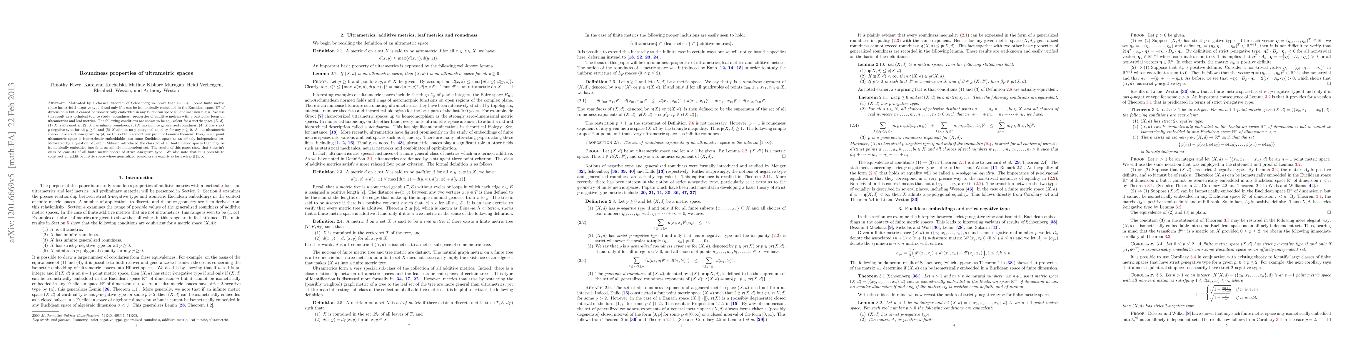 This paper provides new characterizations of ultrametric spaces through roundness properties and related concepts, offering insights into their isometric embedding into Euclidean spaces. It also explores roundness in additive metric spaces that are not ultrametric.