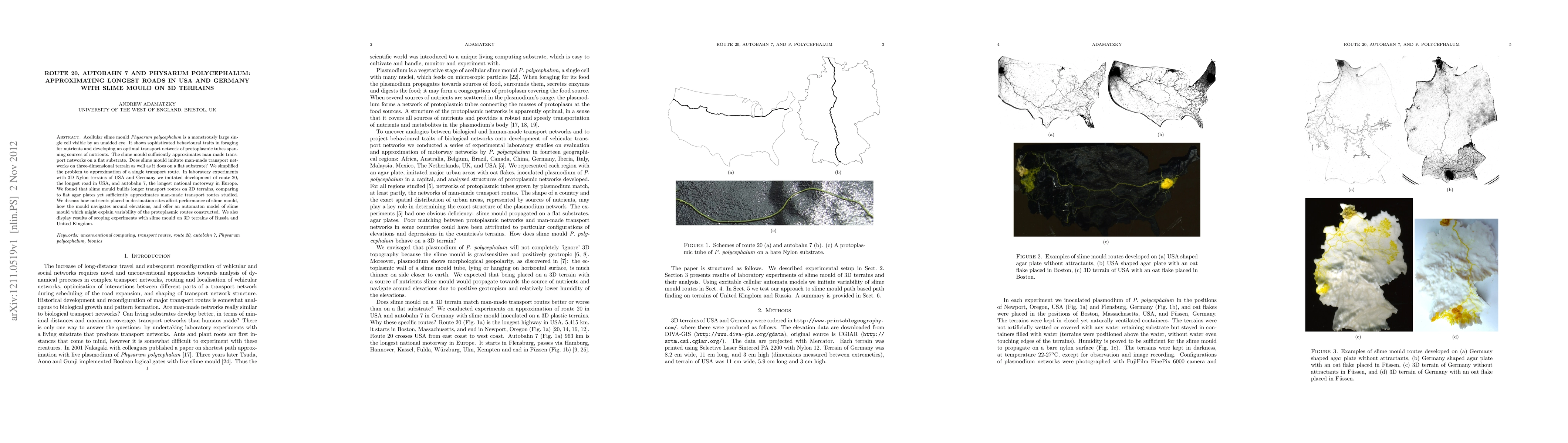 This study investigates whether slime mould Physarum polycephalum can approximate the longest roads in the USA and Germany on 3D terrains, finding that it builds longer routes compared to flat surfaces and sufficiently mimics man-made transport networks. The research also explores the impact of nutrient placement and navigation around terrain elevations, offering a model to explain route variability.