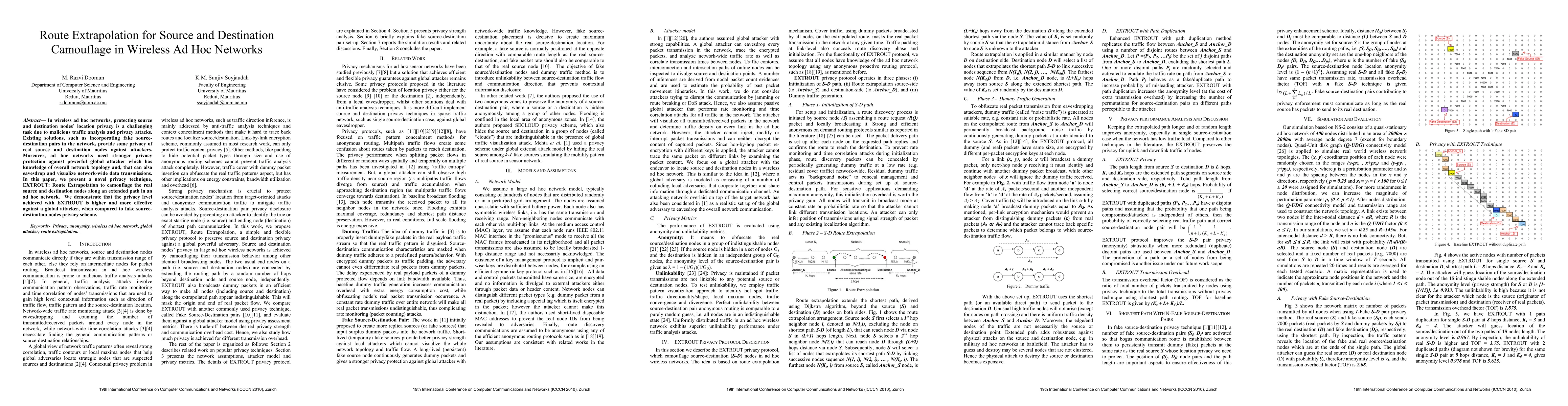 This paper proposes a novel privacy technique called EXTROUT to protect source and destination node locations in ad hoc networks against powerful global attackers, demonstrating higher effectiveness than existing fake source-destination pair schemes.