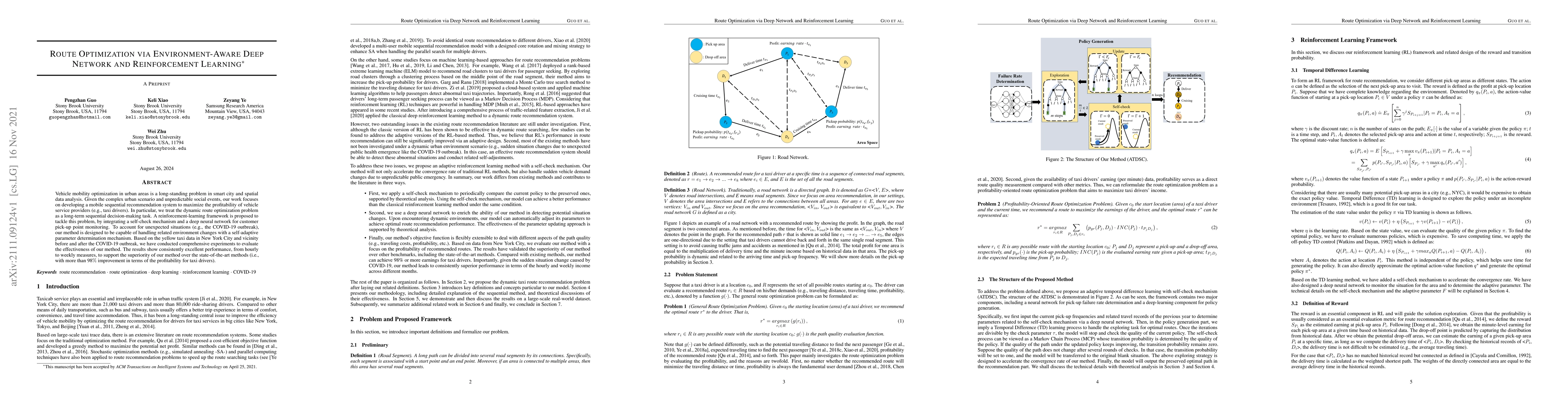 Vehicle mobility optimization in urban areas is a long-standing problem in smart city and spatial data analysis. Given the complex urban scenario and unpredictable social events, our work focuses on developing a mobile sequential recommendation system to maximize the profitability of vehicle service providers (e.g., taxi drivers). In particular, we treat the dynamic route optimization problem as a long-term sequential decision-making task. A reinforcement-learning framework is proposed to tackle this problem, by integrating a self-check mechanism and a deep neural network for customer pick-up point monitoring. To account for unexpected situations (e.g., the COVID-19 outbreak), our method is designed to be capable of handling related environment changes with a self-adaptive parameter determination mechanism. Based on the yellow taxi data in New York City and vicinity before and after the COVID-19 outbreak, we have conducted comprehensive experiments to evaluate the effectiveness of our method. The results show consistently excellent performance, from hourly to weekly measures, to support the superiority of our method over the state-of-the-art methods (i.e., with more than 98% improvement in terms of the profitability for taxi drivers).