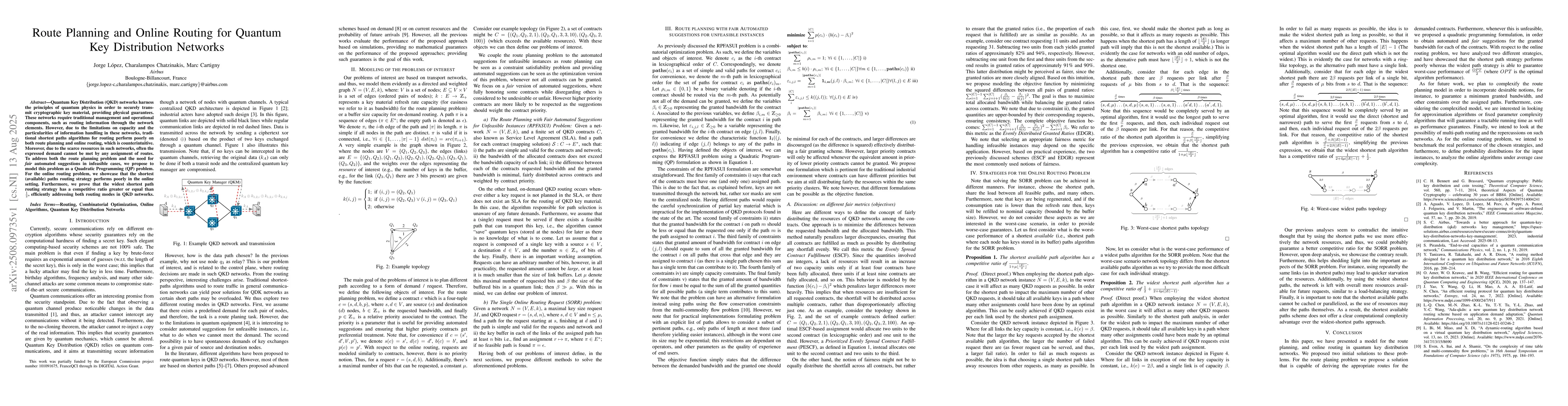 Quantum Key Distribution (QKD) networks harness the principles of quantum physics in order to securely transmit cryptographic key material, providing physical guarantees. These networks require traditional management and operational components, such as routing information through the network elements. However, due to the limitations on capacity and the particularities of information handling in these networks, traditional shortest paths algorithms for routing perform poorly on both route planning and online routing, which is counterintuitive. Moreover, due to the scarce resources in such networks, often the expressed demand cannot be met by any assignment of routes. To address both the route planning problem and the need for fair automated suggestions in infeasible cases, we propose to model this problem as a Quadratic Programming (QP) problem. For the online routing problem, we showcase that the shortest (available) paths routing strategy performs poorly in the online setting. Furthermore, we prove that the widest shortest path routing strategy has a competitive ratio greater or equal than $\frac{1}{2}$, efficiently addressing both routing modes in QKD networks.