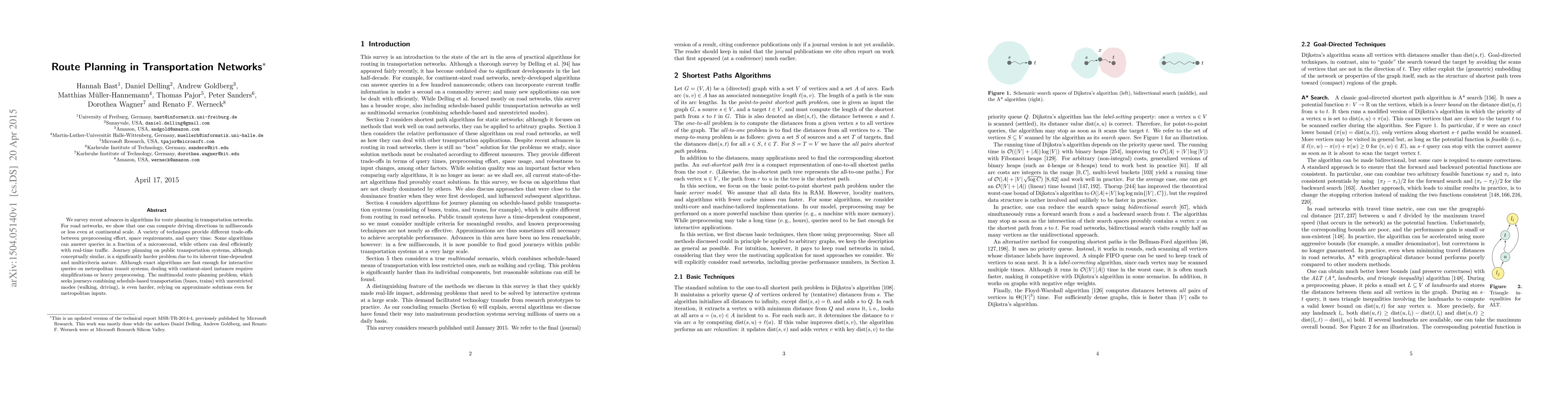 This paper surveys recent advancements in route planning algorithms for transportation networks, highlighting efficient methods for road networks and the challenges of planning for public transit and multimodal journeys, which often require approximations due to their complexity.