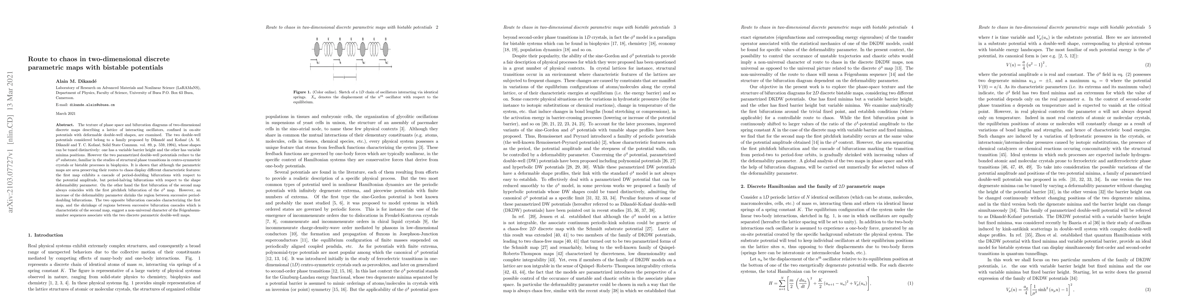 The texture of phase space and bifurcation diagrams of two-dimensional discrete maps describing a lattice of interacting oscillators, confined in on-site potentials with deformable double-well shapes, are examined. The two double-well potentials considered belong to a family proposed by Dikand\'e and Kofan\'e (A. M. Dikand\'e and T. C. Kofan\'e, Solid State Commun. vol. 89, p. 559, 1994), whose shapes can be tuned distinctively: one has a variable barrier height and the other has variable minima positions. However the two parametrized double-well potentials reduce to the $\phi^4$ substrate, familiar in the studies of structural phase transitions in centro-symmetric crystals or bistable processes in biophysics. It is shown that although the parametric maps are area preserving their routes to chaos display different characteristic features: the first map exhibits a cascade of period-doubling bifurcations with respect to the potential amplitude, but period-halving bifurcations with respect to the shape deformability parameter. On the other hand the first bifurcation of the second map always coincides with the first pitchfork bifurcation of the $\phi^4$ map. However, an increase of the deformability parameter shrinks the region between successive period-doubling bifurcations. The two opposite bifurcation cascades characterizing the first map, and the shrinkage of regions between successive bifurcation cascades which is characteristic of the second map, suggest a non-universal character of the Feigenbaum-number sequences associate with the two discrete parametric double-well maps.