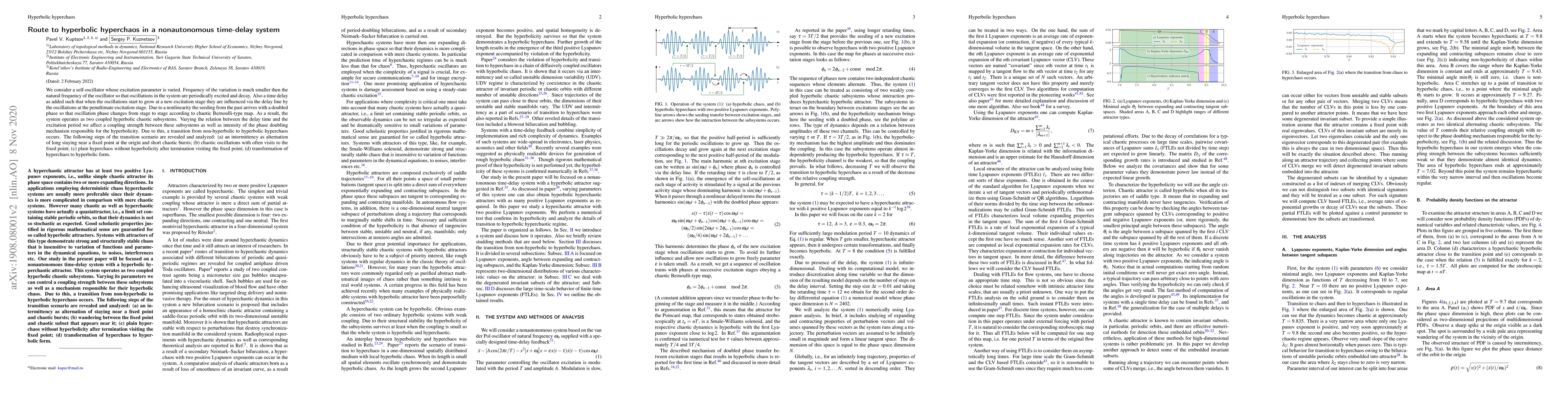 This paper investigates a nonautonomous time-delay system where varying the excitation parameter leads to a route to hyperbolic hyperchaos. The system exhibits a transition through intermittency, chaotic oscillations, and plain hyperchaos to a fully hyperbolic chaotic state due to the interplay between delay time and excitation period.