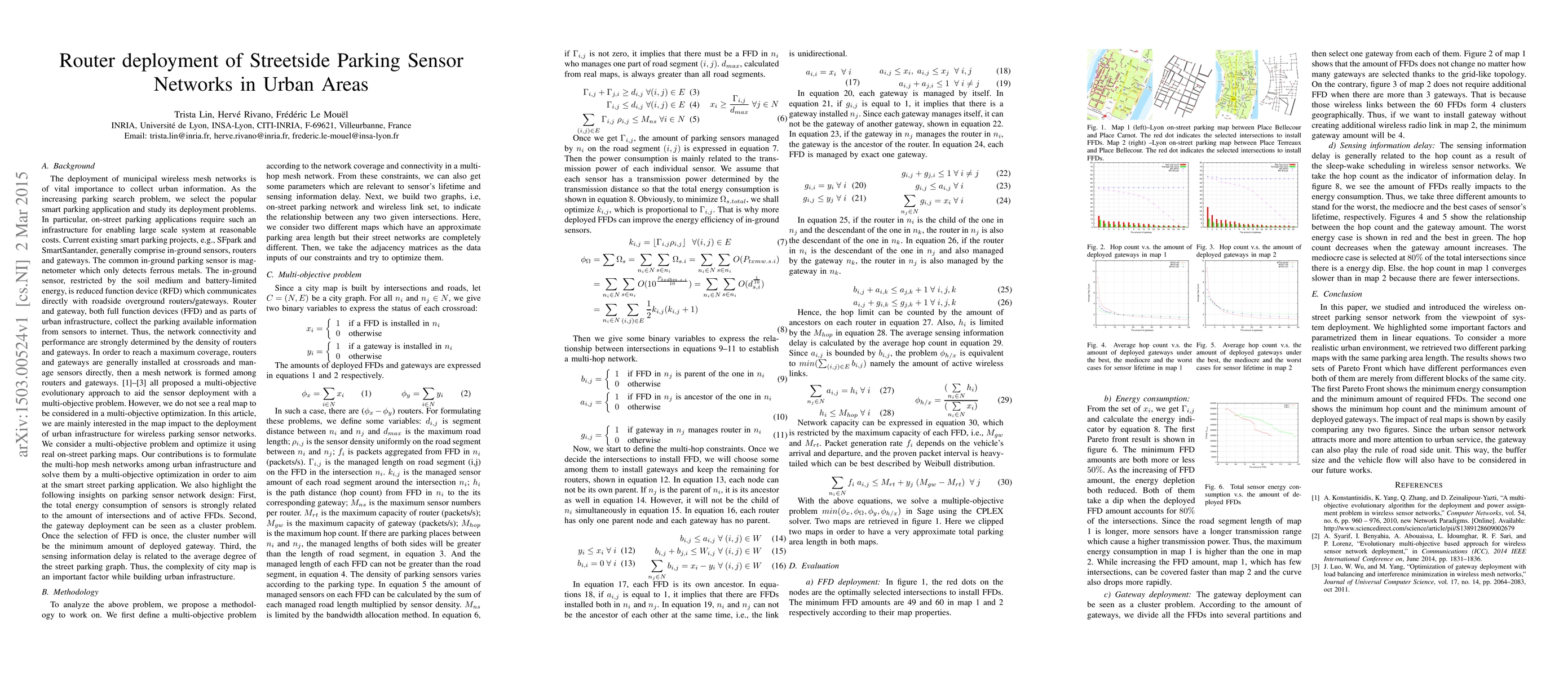 This paper proposes a deployment strategy for wireless on-street parking sensor networks in urban areas, optimizing for energy consumption, sensing delay, and the number of routers and gateways. The results present two sets of Pareto Front solutions that can guide urban service roadside unit deployment or inform the design of deployment algorithms.