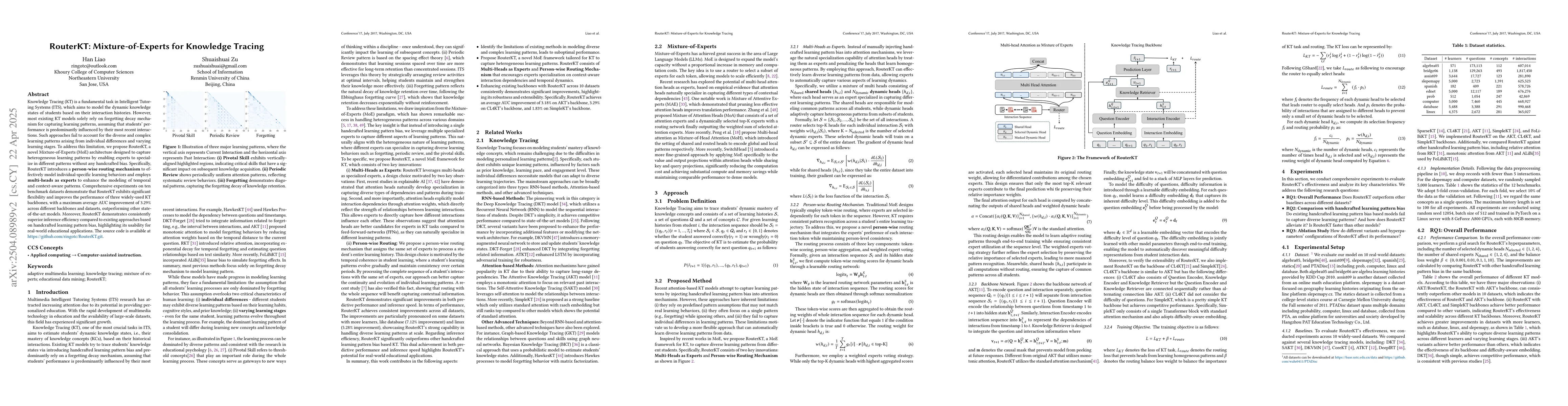 RouterKT proposes a Mixture-of-Experts (MoE) architecture for Knowledge Tracing (KT) that includes a person-wise routing mechanism and multi-head experts to model individual-specific learning behaviors and complex patterns without handcrafted biases.