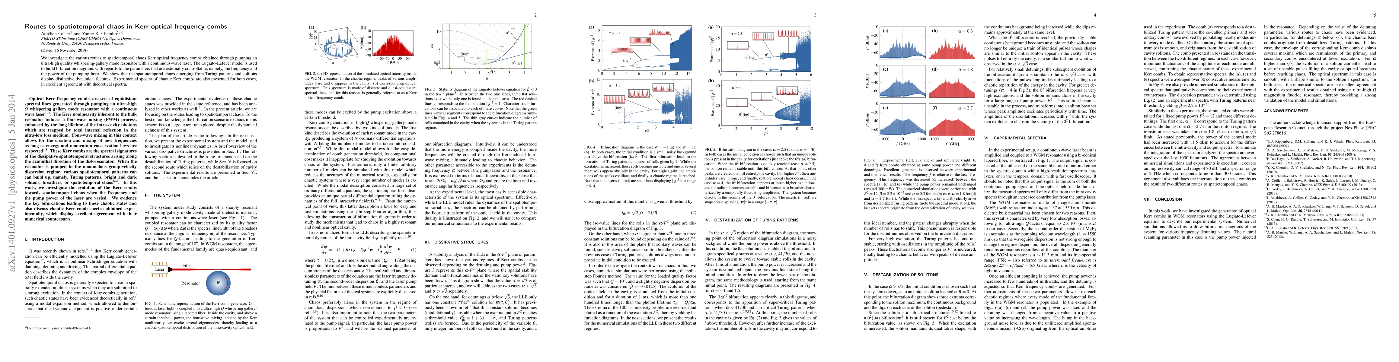 This paper explores the routes to spatiotemporal chaos in Kerr optical frequency combs, using the Lugiato-Lefever model to analyze bifurcations influenced by laser pumping frequency and power. It identifies distinct dynamical features in chaos originating from Turing patterns and solitons, validated by experimental spectra matching theoretical predictions.