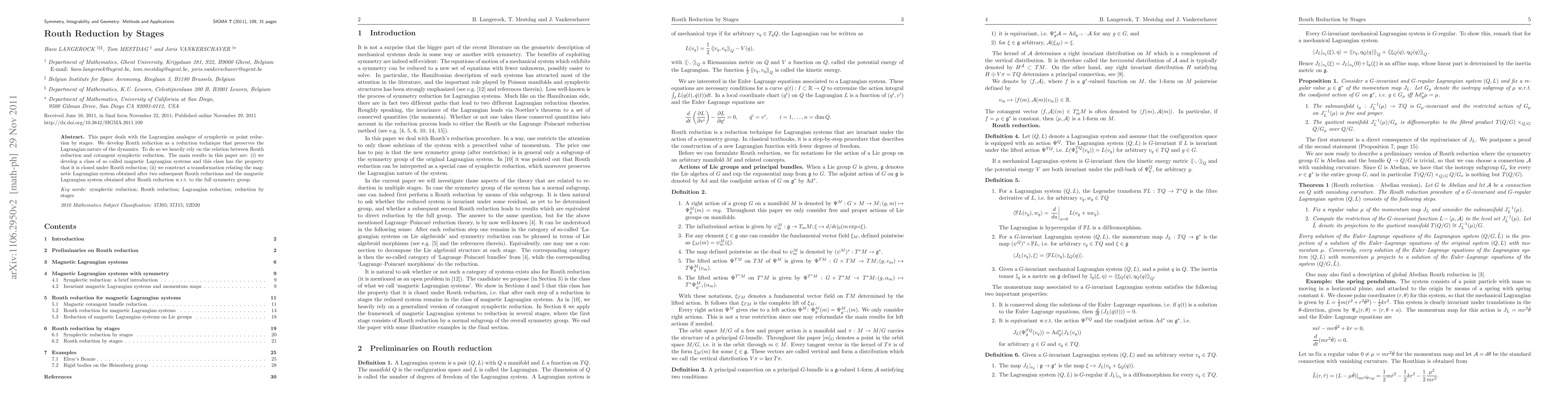 This paper introduces Routh reduction as a Lagrangian analogue of symplectic reduction, preserving the Lagrangian dynamics and establishing a connection to cotangent symplectic reduction. It develops magnetic Lagrangian systems that remain closed under Routh reduction and constructs a transformation linking systems after multiple reductions to one after full symmetry group reduction.