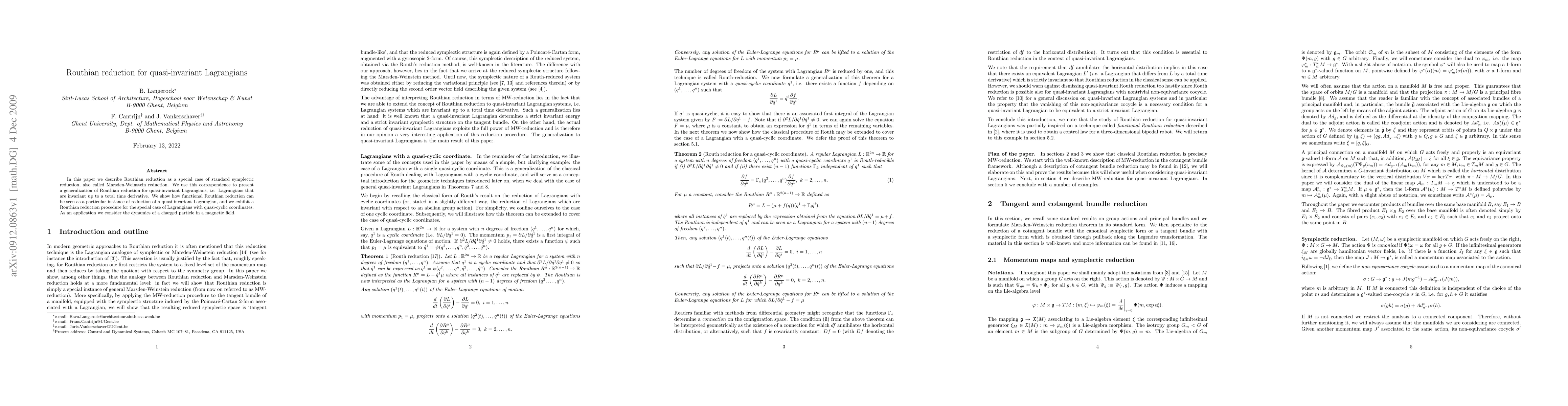 This paper generalizes Routhian reduction for quasi-invariant Lagrangians, demonstrating its connection to symplectic reduction, and applies the method to Lagrangians with quasi-cyclic coordinates, exemplified by the dynamics of a charged particle in a magnetic field.
