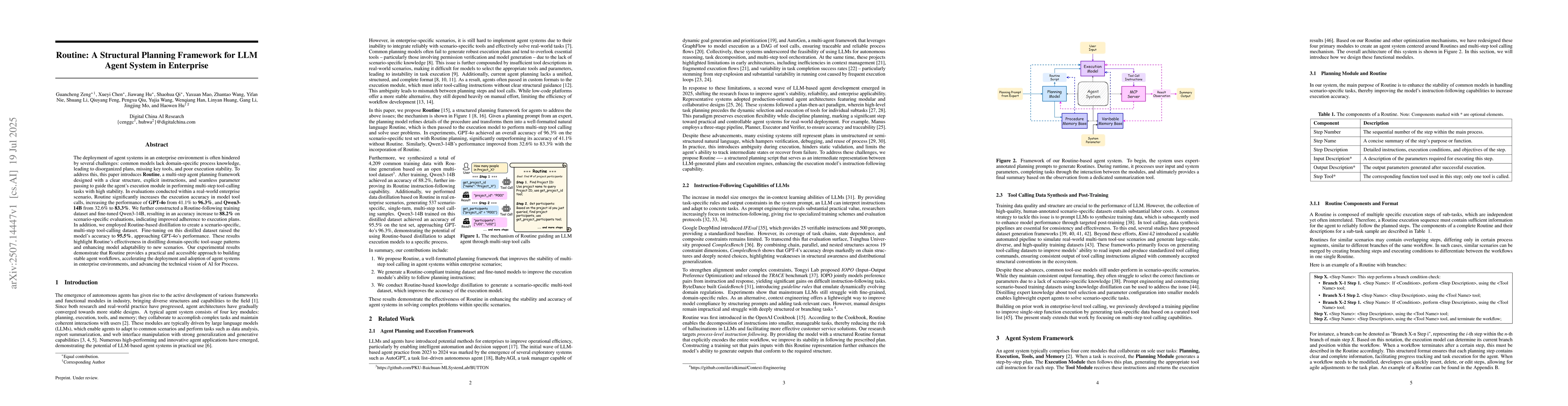 The deployment of agent systems in an enterprise environment is often hindered by several challenges: common models lack domain-specific process knowledge, leading to disorganized plans, missing key tools, and poor execution stability. To address this, this paper introduces Routine, a multi-step agent planning framework designed with a clear structure, explicit instructions, and seamless parameter passing to guide the agent's execution module in performing multi-step tool-calling tasks with high stability. In evaluations conducted within a real-world enterprise scenario, Routine significantly increases the execution accuracy in model tool calls, increasing the performance of GPT-4o from 41.1% to 96.3%, and Qwen3-14B from 32.6% to 83.3%. We further constructed a Routine-following training dataset and fine-tuned Qwen3-14B, resulting in an accuracy increase to 88.2% on scenario-specific evaluations, indicating improved adherence to execution plans. In addition, we employed Routine-based distillation to create a scenario-specific, multi-step tool-calling dataset. Fine-tuning on this distilled dataset raised the model's accuracy to 95.5%, approaching GPT-4o's performance. These results highlight Routine's effectiveness in distilling domain-specific tool-usage patterns and enhancing model adaptability to new scenarios. Our experimental results demonstrate that Routine provides a practical and accessible approach to building stable agent workflows, accelerating the deployment and adoption of agent systems in enterprise environments, and advancing the technical vision of AI for Process.