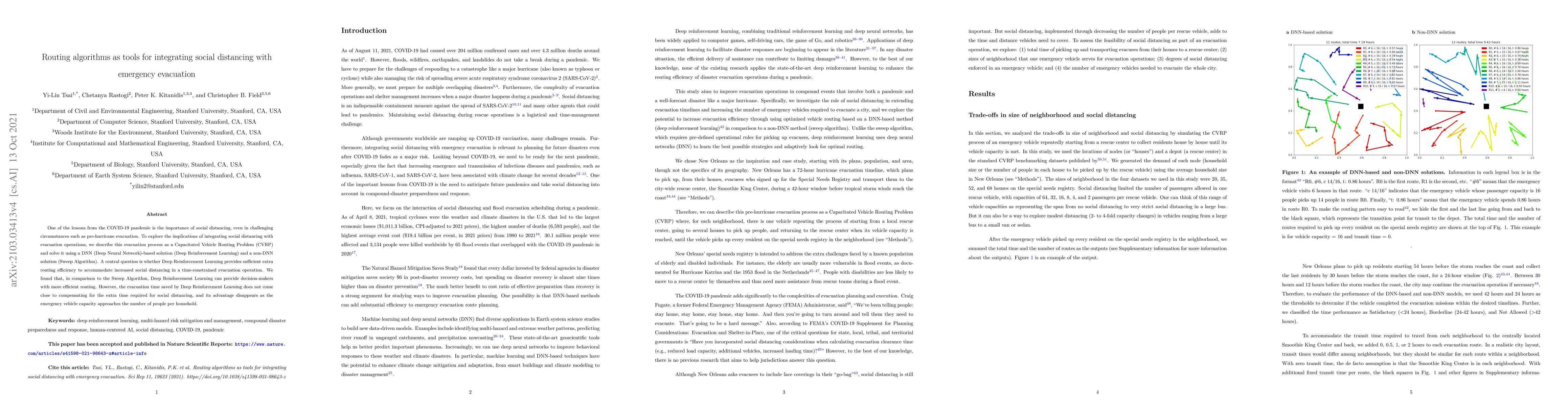 One of the lessons from the COVID-19 pandemic is the importance of social distancing, even in challenging circumstances such as pre-hurricane evacuation. To explore the implications of integrating social distancing with evacuation operations, we describe this evacuation process as a Capacitated Vehicle Routing Problem (CVRP) and solve it using a DNN (Deep Neural Network)-based solution (Deep Reinforcement Learning) and a non-DNN solution (Sweep Algorithm). A central question is whether Deep Reinforcement Learning provides sufficient extra routing efficiency to accommodate increased social distancing in a time-constrained evacuation operation. We found that, in comparison to the Sweep Algorithm, Deep Reinforcement Learning can provide decision-makers with more efficient routing. However, the evacuation time saved by Deep Reinforcement Learning does not come close to compensating for the extra time required for social distancing, and its advantage disappears as the emergency vehicle capacity approaches the number of people per household.