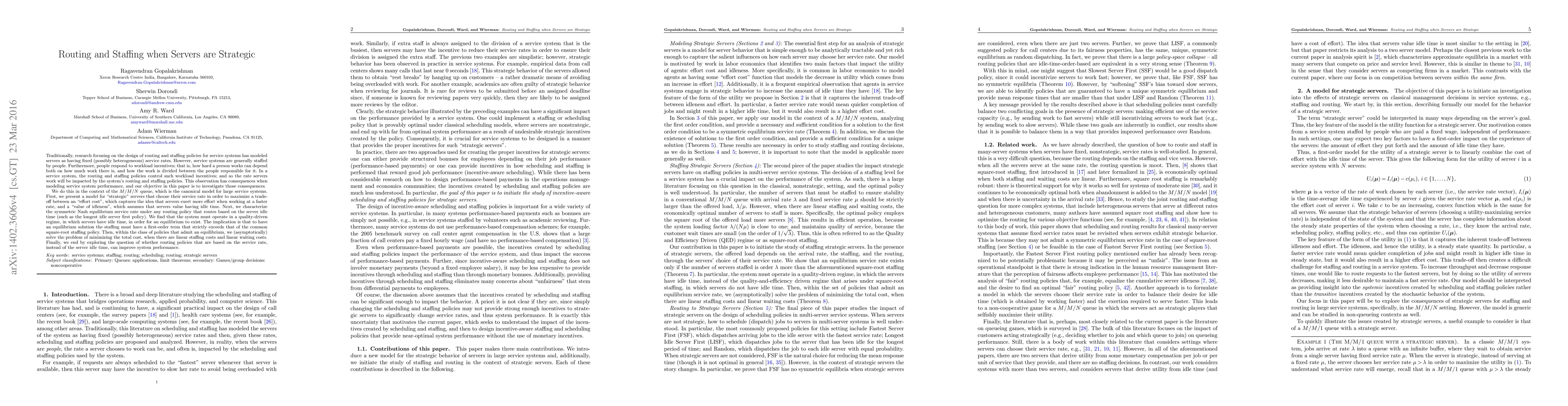 Traditionally, research focusing on the design of routing and staffing policies for service systems has modeled servers as having fixed (possibly heterogeneous) service rates. However, service systems are generally staffed by people. Furthermore, people respond to workload incentives; that is, how hard a person works can depend both on how much work there is, and how the work is divided between the people responsible for it. In a service system, the routing and staffing policies control such workload incentives; and so the rate servers work will be impacted by the system's routing and staffing policies. This observation has consequences when modeling service system performance, and our objective is to investigate those consequences. We do this in the context of the M/M/N queue, which is the canonical model for large service systems. First, we present a model for "strategic" servers that choose their service rate in order to maximize a trade-off between an "effort cost", which captures the idea that servers exert more effort when working at a faster rate, and a "value of idleness", which assumes that servers value having idle time. Next, we characterize the symmetric Nash equilibrium service rate under any routing policy that routes based on the server idle time. We find that the system must operate in a quality-driven regime, in which servers have idle time, in order for an equilibrium to exist, which implies that the staffing must have a first-order term that strictly exceeds that of the common square-root staffing policy. Then, within the class of policies that admit an equilibrium, we (asymptotically) solve the problem of minimizing the total cost, when there are linear staffing costs and linear waiting costs. Finally, we end by exploring the question of whether routing policies that are based on the service rate, instead of the server idle time, can improve system performance.
