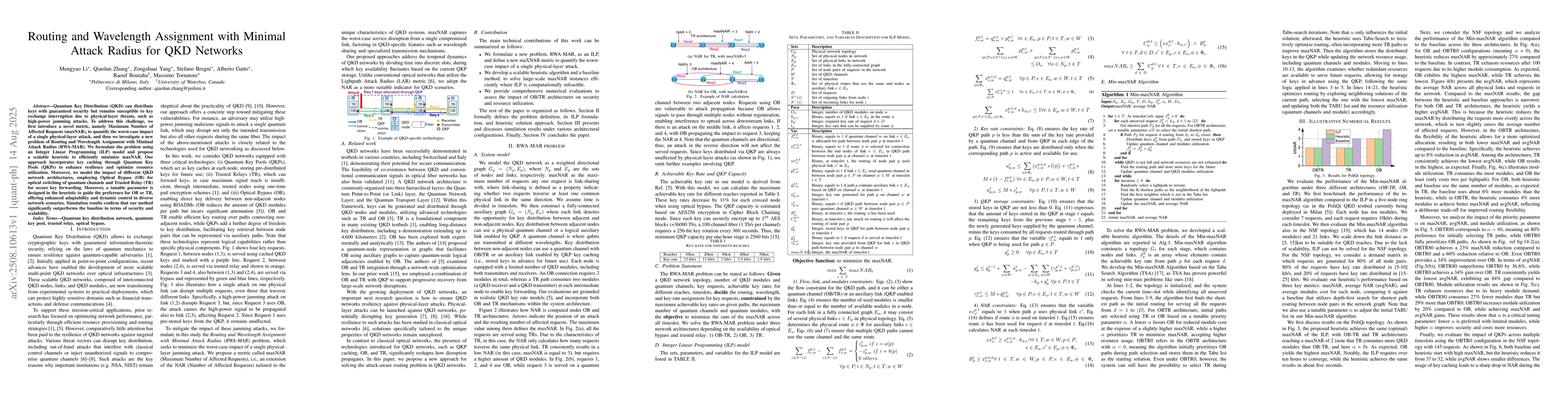 Quantum Key Distribution (QKD) can distribute keys with guaranteed security but remains susceptible to key exchange interruption due to physical-layer threats, such as high-power jamming attacks. To address this challenge, we first introduce a novel metric, namely Maximum Number of Affected Requests (maxNAR), to quantify the worst-case impact of a single physical-layer attack, and then we investigate a new problem of Routing and Wavelength Assignment with Minimal Attack Radius (RWA-MAR). We formulate the problem using an Integer Linear Programming (ILP) model and propose a scalable heuristic to efficiently minimize maxNAR. Our approach incorporates key caching through Quantum Key Pools (QKPs) to enhance resilience and optimize resource utilization. Moreover, we model the impact of different QKD network architectures, employing Optical Bypass (OB) for optical switching of quantum channels and Trusted Relay (TR) for secure key forwarding. Moreover, a tunable parameter is designed in the heuristic to guide the preference for OB or TR, offering enhanced adaptability and dynamic control in diverse network scenarios. Simulation results confirm that our method significantly outperforms the baseline in terms of security and scalability.
