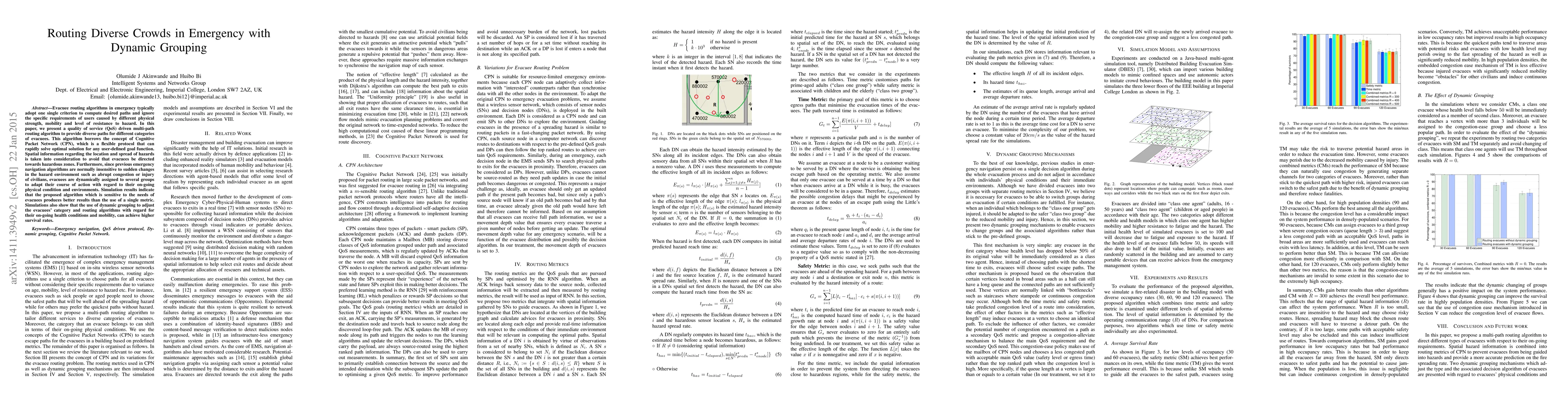 Evacuee routing algorithms in emergency typically adopt one single criterion to compute desired paths and ignore the specific requirements of users caused by different physical strength, mobility and level of resistance to hazard. In this paper, we present a quality of service (QoS) driven multi-path routing algorithm to provide diverse paths for different categories of evacuees. This algorithm borrows the concept of Cognitive Packet Network (CPN), which is a flexible protocol that can rapidly solve optimal solution for any user-defined goal function. Spatial information regarding the location and spread of hazards is taken into consideration to avoid that evacuees be directed towards hazardous zones. Furthermore, since previous emergency navigation algorithms are normally insensitive to sudden changes in the hazard environment such as abrupt congestion or injury of civilians, evacuees are dynamically assigned to several groups to adapt their course of action with regard to their on-going physical condition and environments. Simulation results indicate that the proposed algorithm which is sensitive to the needs of evacuees produces better results than the use of a single metric. Simulations also show that the use of dynamic grouping to adjust the evacuees' category and routing algorithms with regard for their on-going health conditions and mobility, can achieve higher survival rates.