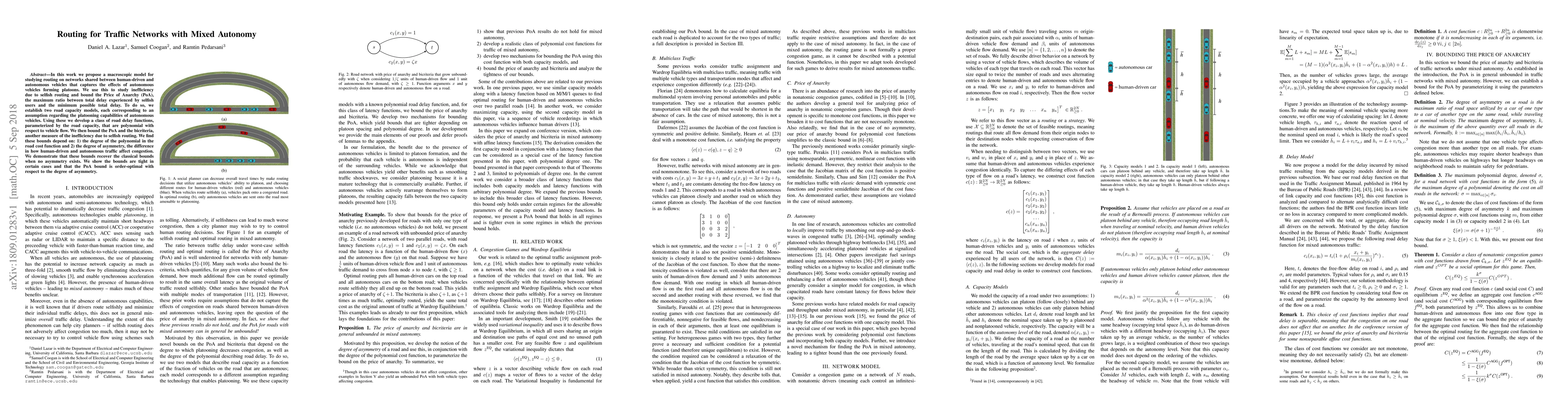 Researchers developed a macroscopic model to study routing on networks with human-driven and autonomous vehicles, finding bounds on inefficiency due to selfish routing that depend on the degree of polynomial in road cost function and asymmetry between human and autonomous traffic.
