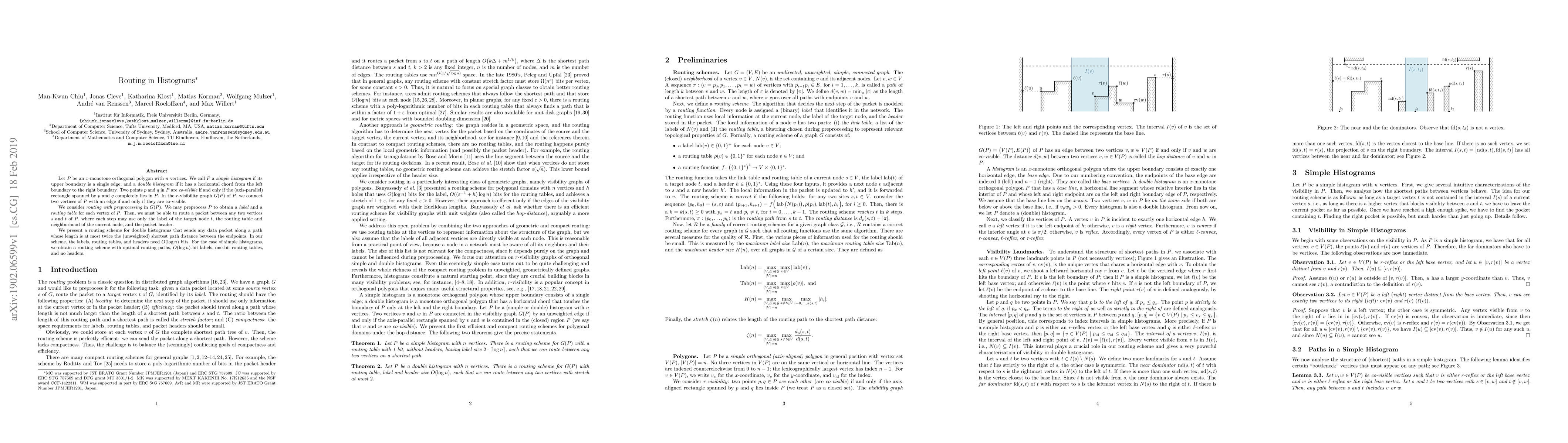 Let $P$ be an $x$-monotone orthogonal polygon with $n$ vertices. We call $P$ a simple histogram if its upper boundary is a single edge; and a double histogram if it has a horizontal chord from the left boundary to the right boundary. Two points $p$ and $q$ in $P$ are co-visible if and only if the (axis-parallel) rectangle spanned by $p$ and $q$ completely lies in $P$. In the $r$-visibility graph $G(P)$ of $P$, we connect two vertices of $P$ with an edge if and only if they are co-visible. We consider routing with preprocessing in $G(P)$. We may preprocess $P$ to obtain a label and a routing table for each vertex of $P$. Then, we must be able to route a packet between any two vertices $s$ and $t$ of $P$, where each step may use only the label of the target node $t$, the routing table and neighborhood of the current node, and the packet header. We present a routing scheme for double histograms that sends any data packet along a path whose length is at most twice the (unweighted) shortest path distance between the endpoints. In our scheme, the labels, routing tables, and headers need $O(\log n)$ bits. For the case of simple histograms, we obtain a routing scheme with optimal routing paths, $O(\log n)$-bit labels, one-bit routing tables, and no headers.
