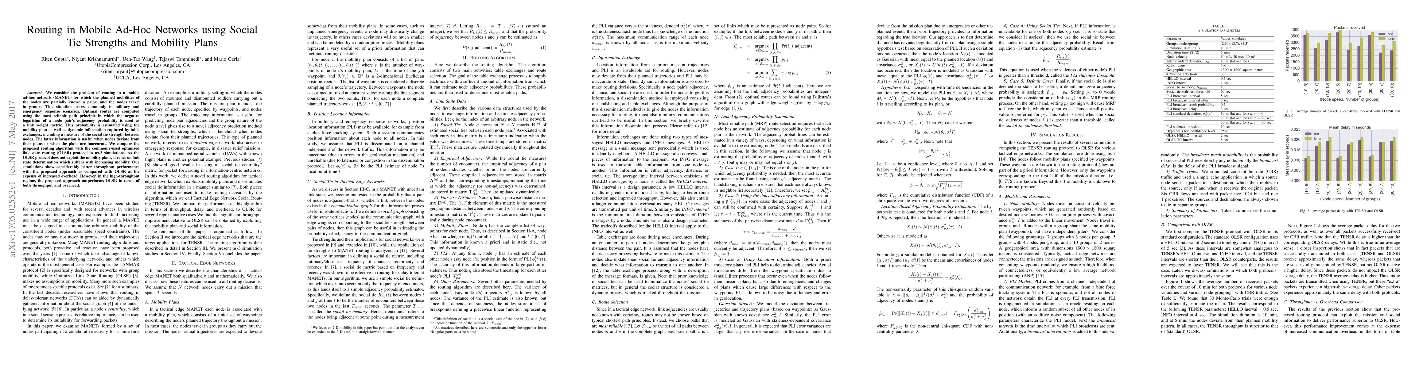 We consider the problem of routing in a mobile ad-hoc network (MANET) for which the planned mobilities of the nodes are partially known a priori and the nodes travel in groups. This situation arises commonly in military and emergency response scenarios. Optimal routes are computed using the most reliable path principle in which the negative logarithm of a node pair's adjacency probability is used as a link weight metric. This probability is estimated using the mobility plan as well as dynamic information captured by table exchanges, including a measure of the social tie strength between nodes. The latter information is useful when nodes deviate from their plans or when the plans are inaccurate. We compare the proposed routing algorithm with the commonly-used optimized link state routing (OLSR) protocol in ns-3 simulations. As the OLSR protocol does not exploit the mobility plans, it relies on link state determination which suffers with increasing mobility. Our simulations show considerably better throughput performance with the proposed approach as compared with OLSR at the expense of increased overhead. However, in the high-throughput regime, the proposed approach outperforms OLSR in terms of both throughput and overhead.
