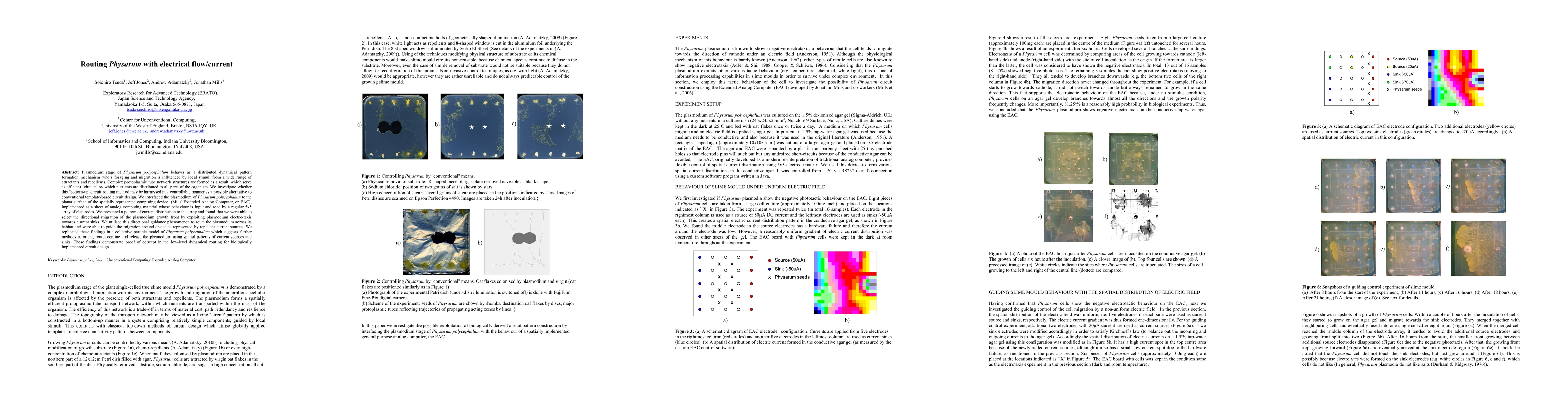 Plasmodium stage of Physarum polycephalum behaves as a distributed dynamical pattern formation mechanism who's foraging and migration is influenced by local stimuli from a wide range of attractants and repellents. Complex protoplasmic tube network structures are formed as a result, which serve as efficient `circuits' by which nutrients are distributed to all parts of the organism. We investigate whether this `bottom-up' circuit routing method may be harnessed in a controllable manner as a possible alternative to conventional template-based circuit design. We interfaced the plasmodium of Physarum polycephalum to the planar surface of the spatially represented computing device, (Mills' Extended Analog Computer, or EAC), implemented as a sheet of analog computing material whose behaviour is input and read by a regular 5x5 array of electrodes. We presented a pattern of current distribution to the array and found that we were able to select the directional migration of the plasmodium growth front by exploiting plasmodium electro-taxis towards current sinks. We utilised this directional guidance phenomenon to route the plasmodium across its habitat and were able to guide the migration around obstacles represented by repellent current sources. We replicated these findings in a collective particle model of Physarum polycephalum which suggests further methods to orient, route, confine and release the plasmodium using spatial patterns of current sources and sinks. These findings demonstrate proof of concept in the low-level dynamical routing for biologically implemented circuit design.