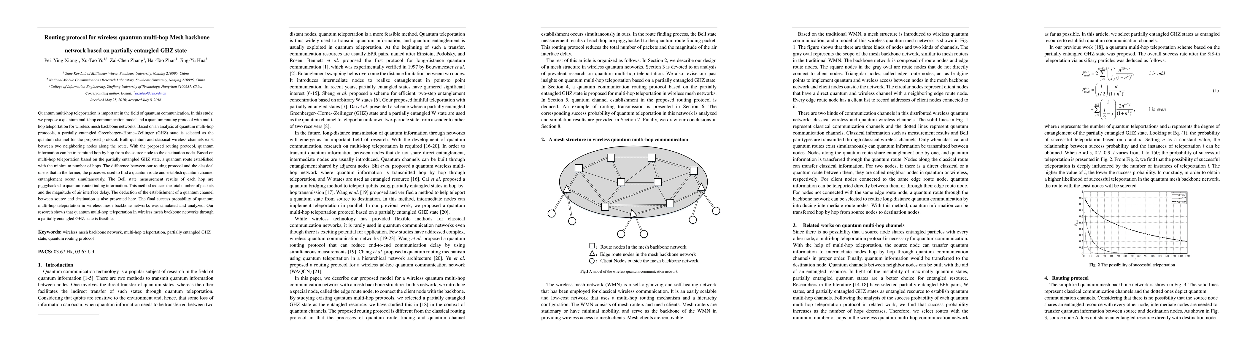 This paper proposes a quantum routing protocol for wireless quantum multi-hop mesh backbone networks using partially entangled GHZ states for multi-hop teleportation. The protocol simultaneously finds quantum routes and establishes entanglement, reducing packet count and air interface delay, and demonstrates feasibility through simulation.