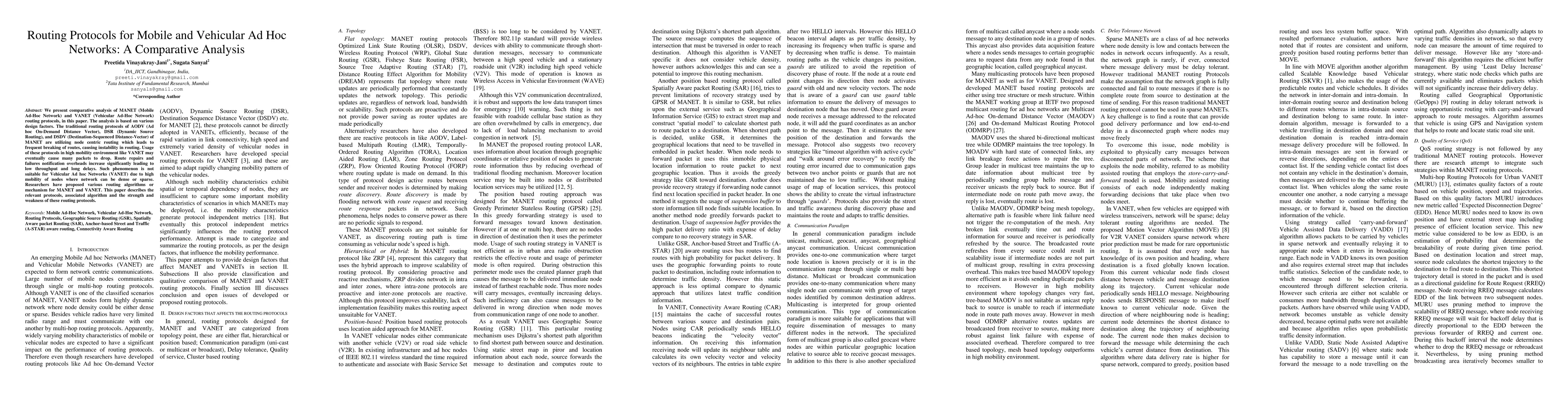 This paper compares MANET and VANET routing protocols, focusing on AODV, DSR, and DSDV for MANETs, which suffer from instability and high overhead in high mobility environments like VANETs. It analyzes the strengths and weaknesses of various routing protocols proposed for both networks.