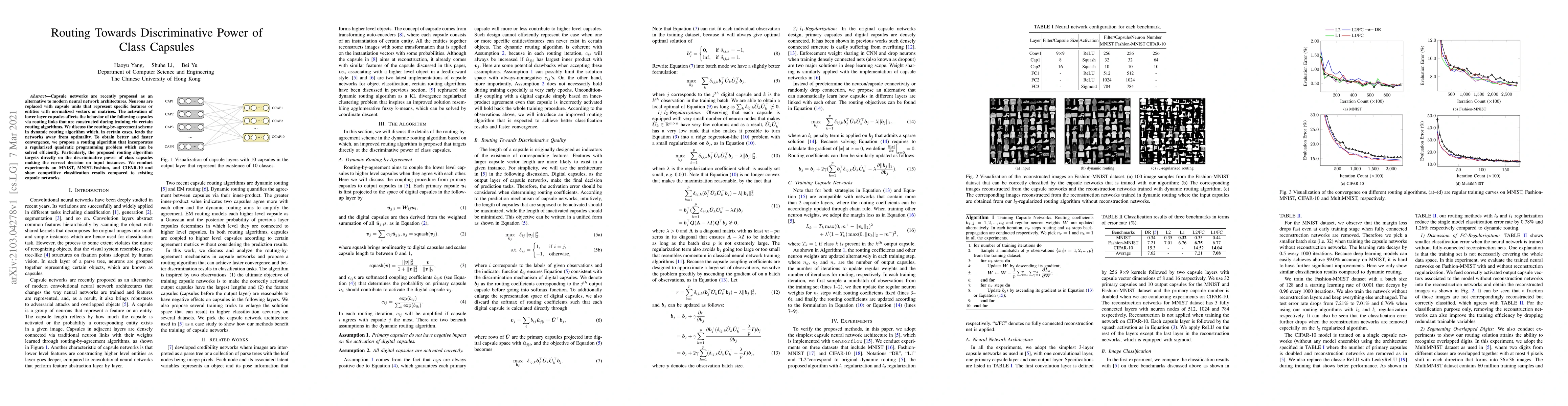 This paper proposes a new routing algorithm for capsule networks that incorporates a regularized quadratic programming problem to enhance the discriminative power of class capsules, leading to faster and better convergence. Experiments on MNIST, MNIST-Fashion, and CIFAR-10 demonstrate competitive classification performance compared to existing methods.