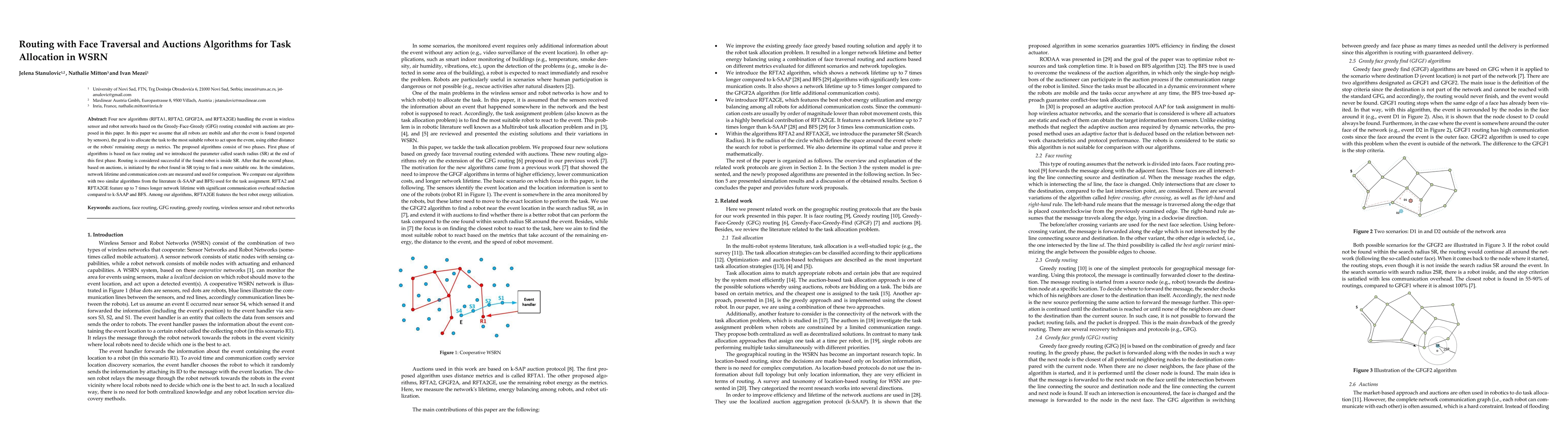 This paper proposes four new algorithms for task allocation in wireless sensor and robot networks, utilizing face traversal and auction mechanisms. The algorithms aim to allocate tasks to the most suitable robot based on distance or energy metrics, significantly extending network lifetime and reducing communication costs compared to existing methods.