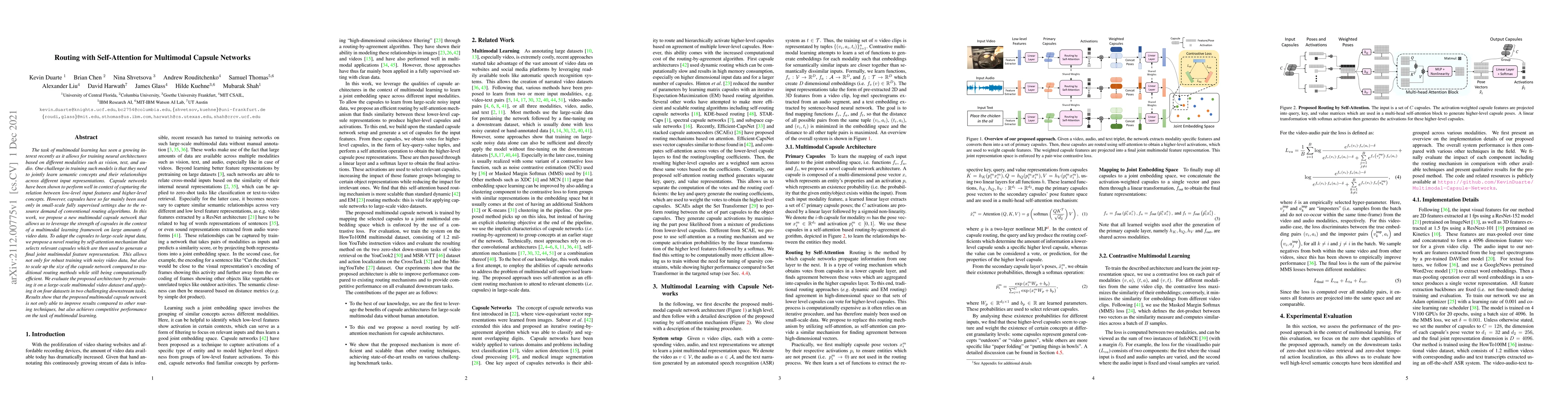The task of multimodal learning has seen a growing interest recently as it allows for training neural architectures based on different modalities such as vision, text, and audio. One challenge in training such models is that they need to jointly learn semantic concepts and their relationships across different input representations. Capsule networks have been shown to perform well in context of capturing the relation between low-level input features and higher-level concepts. However, capsules have so far mainly been used only in small-scale fully supervised settings due to the resource demand of conventional routing algorithms. We present a new multimodal capsule network that allows us to leverage the strength of capsules in the context of a multimodal learning framework on large amounts of video data. To adapt the capsules to large-scale input data, we propose a novel routing by self-attention mechanism that selects relevant capsules which are then used to generate a final joint multimodal feature representation. This allows not only for robust training with noisy video data, but also to scale up the size of the capsule network compared to traditional routing methods while still being computationally efficient. We evaluate the proposed architecture by pretraining it on a large-scale multimodal video dataset and applying it on four datasets in two challenging downstream tasks. Results show that the proposed multimodal capsule network is not only able to improve results compared to other routing techniques, but also achieves competitive performance on the task of multimodal learning.