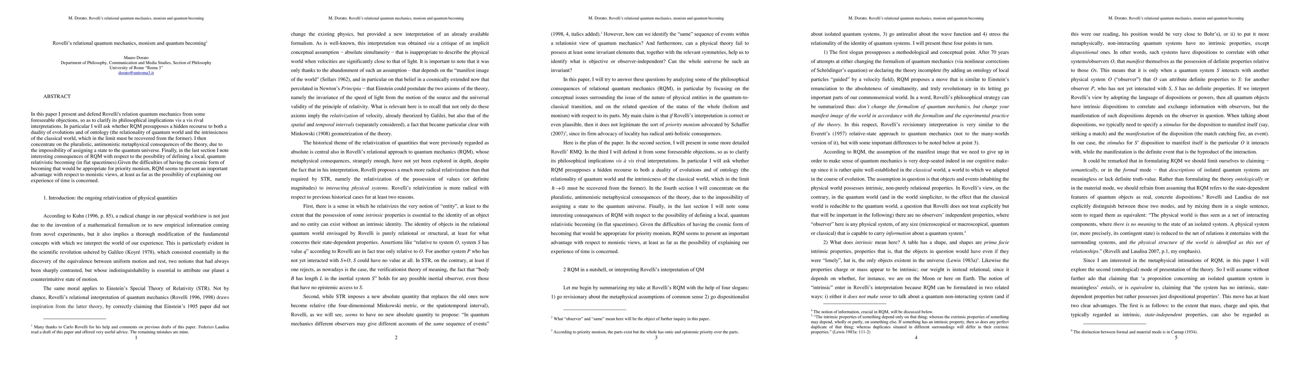 In this paper I present and defend Rovelli's relation quantum mechanics from some foreseeable objections, so as to clarify its philosophical implications vis a vis rival interpretations. In particular I ask whether RQM presupposes a hidden recourse to both a duality of evolutions and of ontology (the relationality of quantum world and the intrinsicness of the classical world, which in the limit must be recovered from the former). I then concentrate on the pluralistic, antimonistic metaphysical consequences of the theory, due to the impossibility of assigning a state to the quantum universe. Finally, in the last section I note interesting consequences of RQM with respect to the possibility of defining a local, quantum relativistic becoming (in flat spacetimes).Given the difficulties of having the cosmic form of becoming that would be appropriate for priority monism, RQM seems to present an important advantage with respect to monistic views, at least as far as the possibility of explaining our experience of time is concerned.