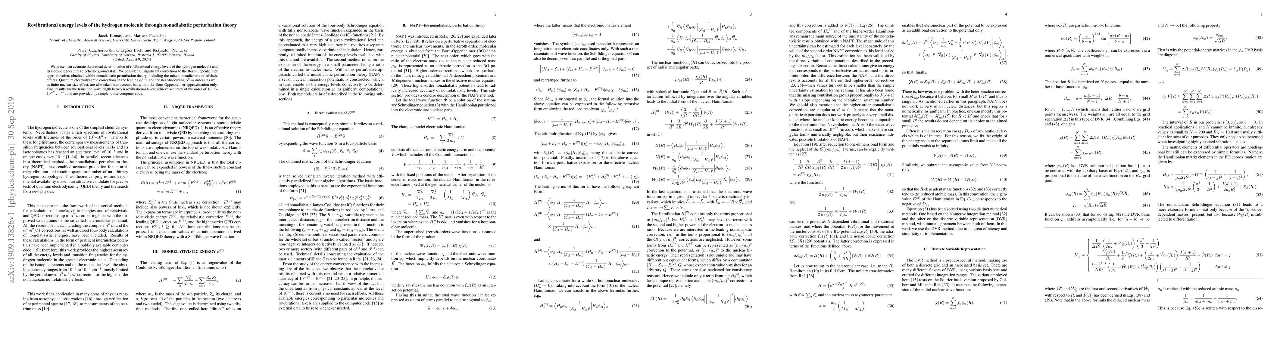This paper provides an accurate theoretical determination of the rovibrational energy levels of the hydrogen molecule and its isotopologues using nonadiabatic perturbation theory, incorporating significant corrections beyond the Born-Oppenheimer approximation. The results achieve high precision, with transition wavelength accuracies of $10^{-3}$--$10^{-7}$ cm$^{-1}$.