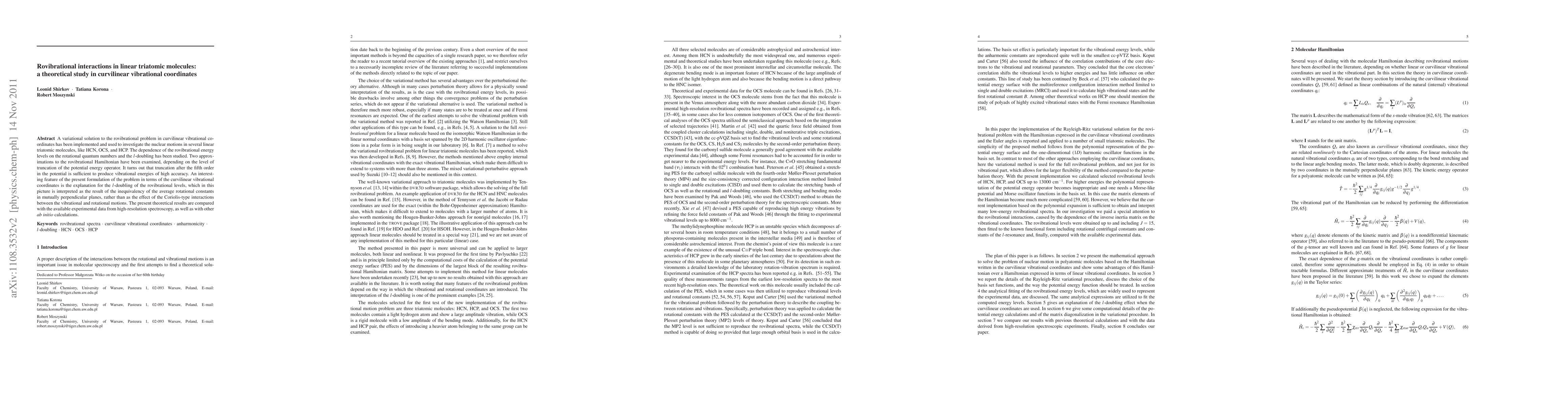 This paper presents a theoretical study on rovibrational interactions in linear triatomic molecules using curvilinear vibrational coordinates, finding that fifth-order truncation of the potential energy operator yields high accuracy. The study explains l-doubling as arising from rotational constant inequivalency rather than Coriolis interactions, and compares results with experimental data and ab initio calculations.