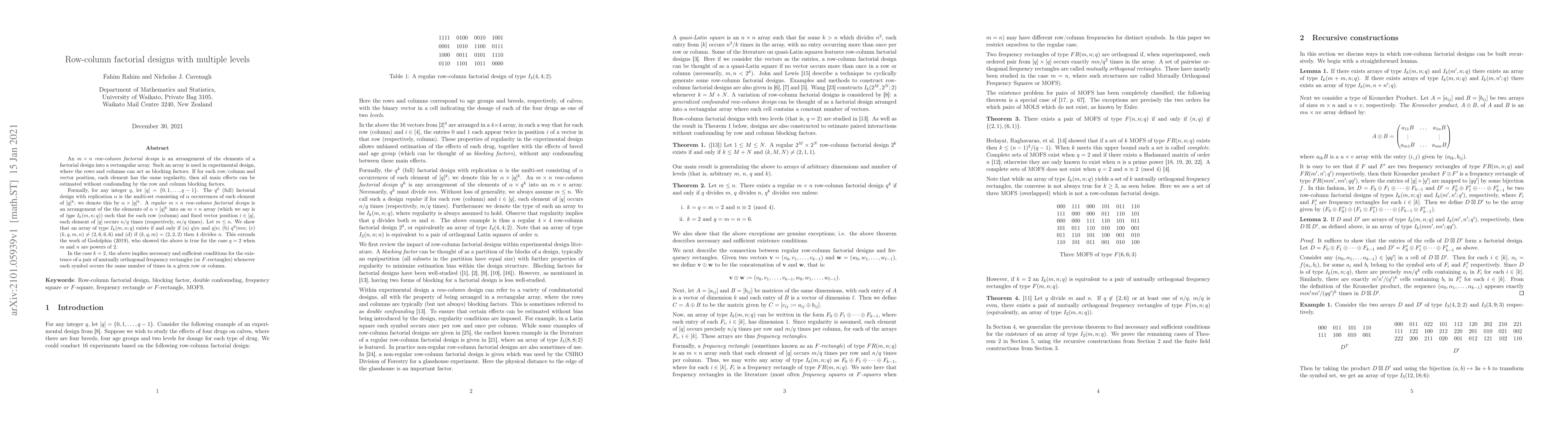 An {\em $m\times n$ row-column factorial design} is an arrangement of the elements of a factorial design into a rectangular array. Such an array is used in experimental design, where the rows and columns can act as blocking factors. If for each row/column and vector position, each element has the same regularity, then all main effects can be estimated without confounding by the row and column blocking factors. Formally, for any integer $q$, let $[q]=\{0,1,\dots ,q-1\}$. The $q^k$ (full) factorial design with replication $\alpha$ is the multi-set consisting of $\alpha$ occurrences of each element of $[q]^k$; we denote this by $\alpha\times [q]^k$. A {\em regular $m\times n$ row-column factorial design} is an arrangement of the the elements of $\alpha \times [q]^k$ into an $m\times n$ array (which we say is of {\em type} $I_k(m,n;q)$) such that for each row (column) and fixed vector position $i\in [q]$, each element of $[q]$ occurs $n/q$ times (respectively, $m/q$ times). Let $m\leq n$. We show that an array of type $I_k(m,n;q)$ exists if and only if (a) $q|m$ and $q|n$; (b) $q^k|mn$; (c) $(k,q,m,n)\neq (2,6,6,6)$ and (d) if $(k,q,m)=(2,2,2)$ then $4$ divides $n$. This extends the work of Godolphin (2019), who showed the above is true for the case $q=2$ when $m$ and $n$ are powers of $2$. In the case $k=2$, the above implies necessary and sufficient conditions for the existence of a pair of mutually orthogonal frequency rectangles (or $F$-rectangles) whenever each symbol occurs the same number of times in a given row or column.