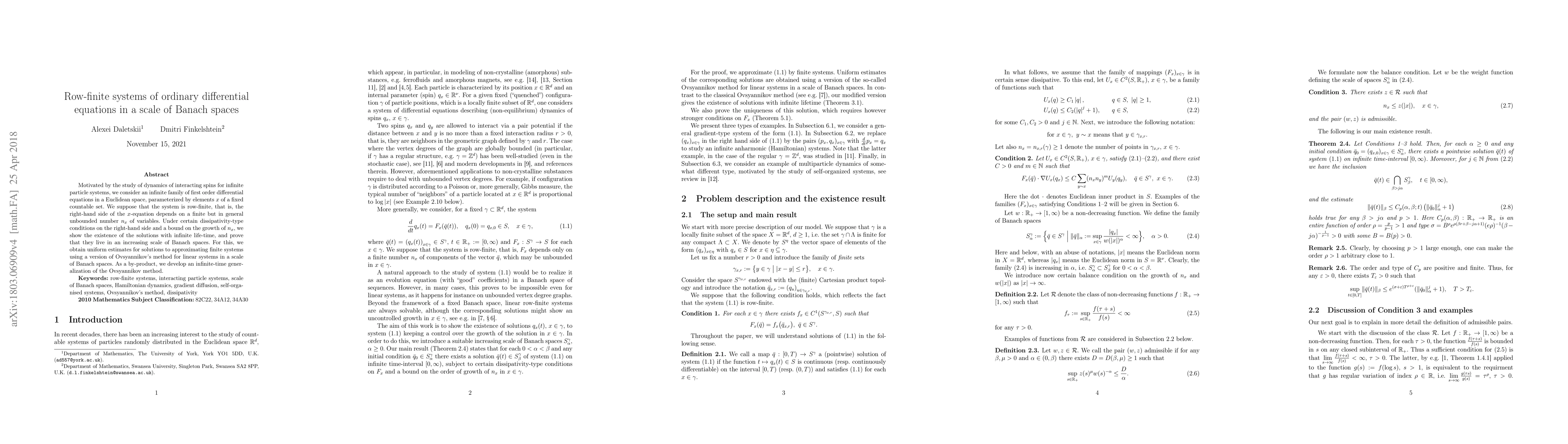 Motivated by the study of dynamics of interacting spins for infinite particle systems, we consider an infinite family of first order differential equations in a Euclidean space, parameterized by elements $x$ of a fixed countable set. We suppose that the system is row-finite, that is, the right-hand side of the $x$-equation depends on a finite but in general unbounded number $n_x$ of variables. Under certain dissipativity-type conditions on the right-hand side and a bound on the growth of $n_x$, we show the existence of the solutions with infinite life-time, and prove that they live in an increasing scale of Banach spaces. For this, we obtain uniform estimates for solutions to approximating finite systems using a version of Ovsyannikov's method for linear systems in a scale of Banach spaces. As a by-product, we develop an infinite-time generalization of the Ovsyannikov method.