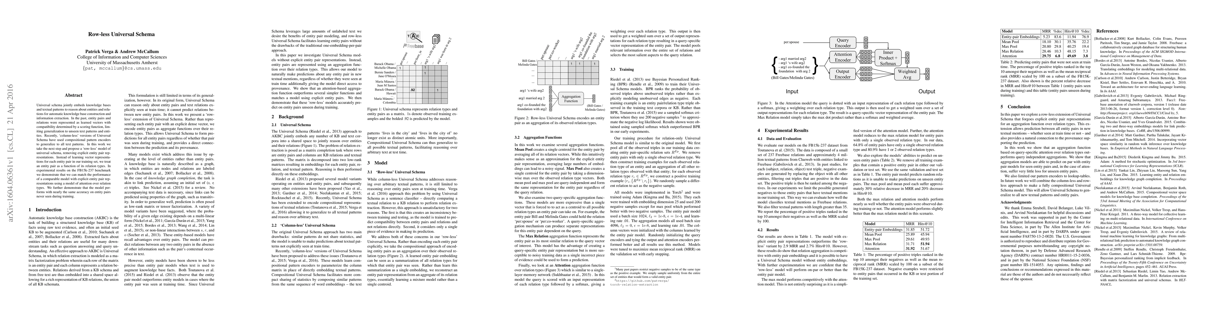 The main technical contribution is the introduction of a 'row-less' Universal Schema model that aggregates entity pairs based on observed relation types, using attention-based aggregation functions to outperform simpler aggregation methods and models with explicit entity pair representations.