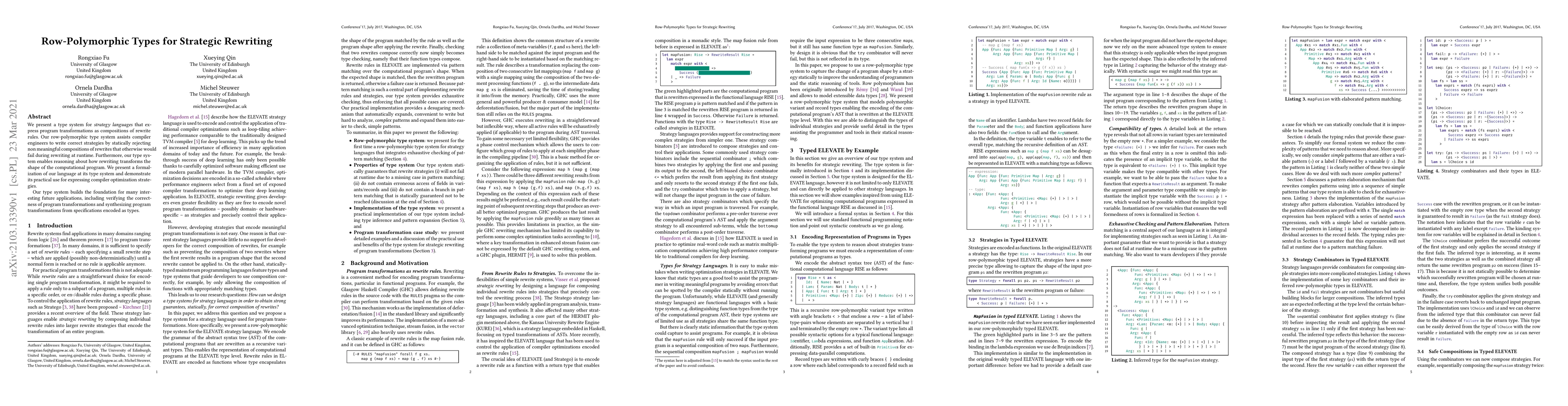 This paper introduces a row-polymorphic type system for strategy languages facilitating program transformations via rewrite rules, ensuring static detection of invalid compositions and enabling reasoning about program shape transformations. It demonstrates practical use in compiler optimization strategies and lays the groundwork for future applications like transformation verification and synthesis.