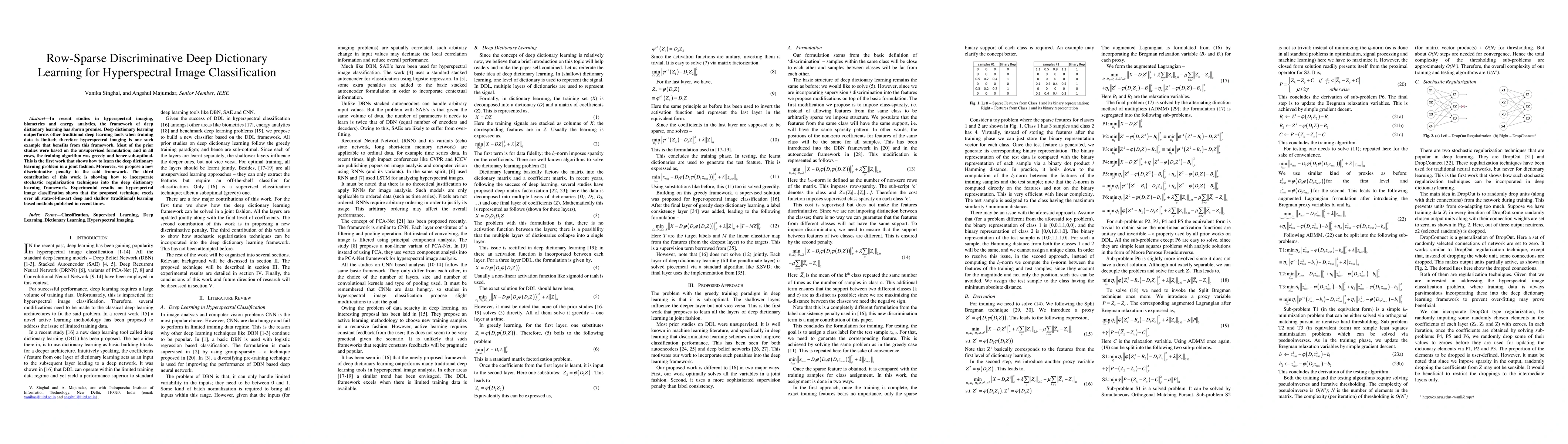 This paper proposes a row-sparse discriminative deep dictionary learning framework for hyperspectral image classification, introducing a joint learning algorithm, a discriminative penalty, and stochastic regularization techniques. Experimental results demonstrate superior performance compared to state-of-the-art methods.