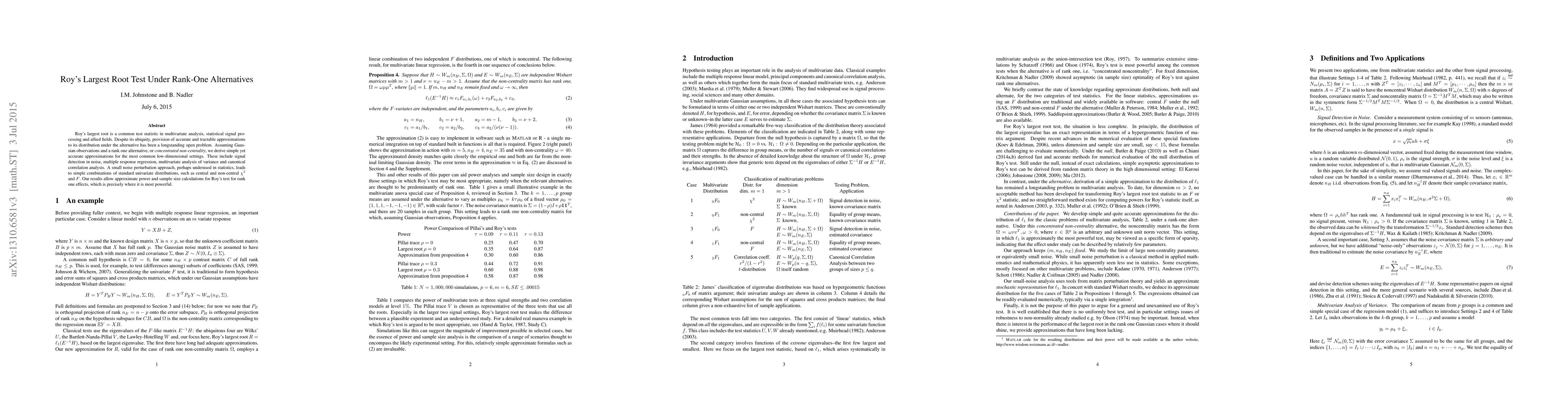 Roy's largest root is a common test statistic in multivariate analysis, statistical signal processing and allied fields. Despite its ubiquity, provision of accurate and tractable approximations to its distribution under the alternative has been a longstanding open problem. Assuming Gaussian observations and a rank one alternative, or concentrated non-centrality, we derive simple yet accurate approximations for the most common low-dimensional settings. These include signal detection in noise, multiple response regression, multivariate analysis of variance and canonical correlation analysis. A small noise perturbation approach, perhaps underused in statistics, leads to simple combinations of standard univariate distributions, such as central and non-central $\chi^2$ and $F$. Our results allow approximate power and sample size calculations for Roy's test for rank one effects, which is precisely where it is most powerful.