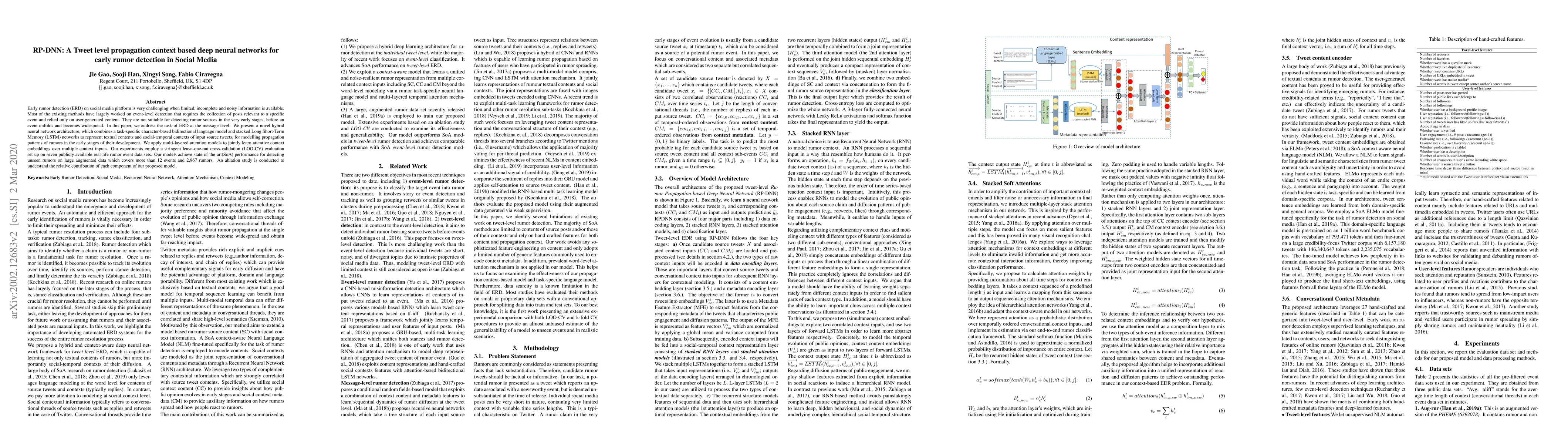 This paper introduces RP-DNN, a deep neural network architecture for early rumor detection on social media at the tweet level. It combines character-based bidirectional language models and stacked LSTM networks to capture textual and social-temporal contexts, achieving state-of-the-art performance in detecting early-stage rumors across multiple datasets.