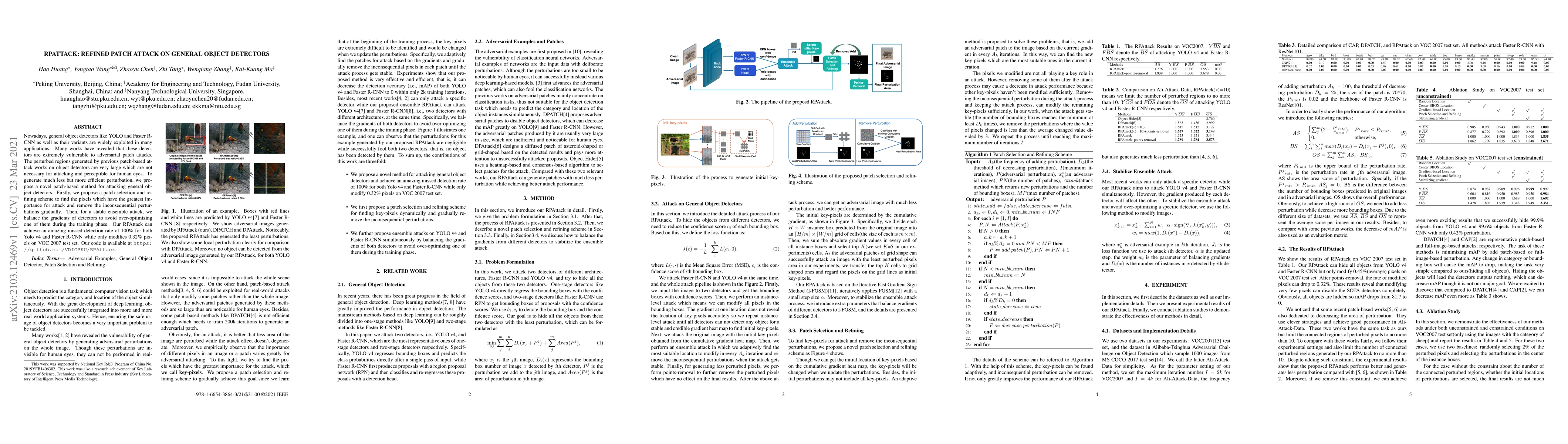 RPATTACK introduces a refined patch attack method that significantly reduces the size of perturbations while maintaining high attack efficacy on general object detectors like YOLO and Faster R-CNN. The method achieves 100% missed detection rate with only 0.32% pixel modification on the VOC 2007 test set.