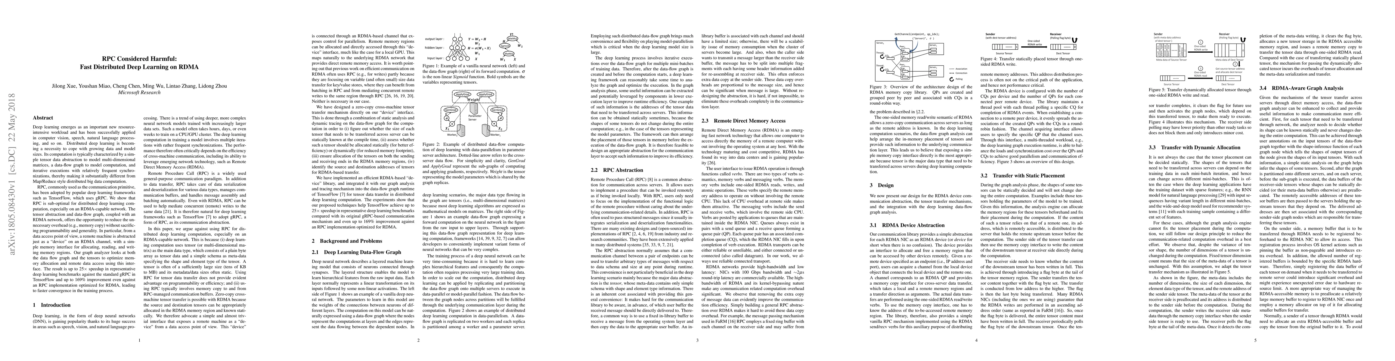 Deep learning emerges as an important new resource-intensive workload and has been successfully applied in computer vision, speech, natural language processing, and so on. Distributed deep learning is becoming a necessity to cope with growing data and model sizes. Its computation is typically characterized by a simple tensor data abstraction to model multi-dimensional matrices, a data-flow graph to model computation, and iterative executions with relatively frequent synchronizations, thereby making it substantially different from Map/Reduce style distributed big data computation. RPC, commonly used as the communication primitive, has been adopted by popular deep learning frameworks such as TensorFlow, which uses gRPC. We show that RPC is sub-optimal for distributed deep learning computation, especially on an RDMA-capable network. The tensor abstraction and data-flow graph, coupled with an RDMA network, offers the opportunity to reduce the unnecessary overhead (e.g., memory copy) without sacrificing programmability and generality. In particular, from a data access point of view, a remote machine is abstracted just as a "device" on an RDMA channel, with a simple memory interface for allocating, reading, and writing memory regions. Our graph analyzer looks at both the data flow graph and the tensors to optimize memory allocation and remote data access using this interface. The result is up to 25 times speedup in representative deep learning benchmarks against the standard gRPC in TensorFlow and up to 169% improvement even against an RPC implementation optimized for RDMA, leading to faster convergence in the training process.