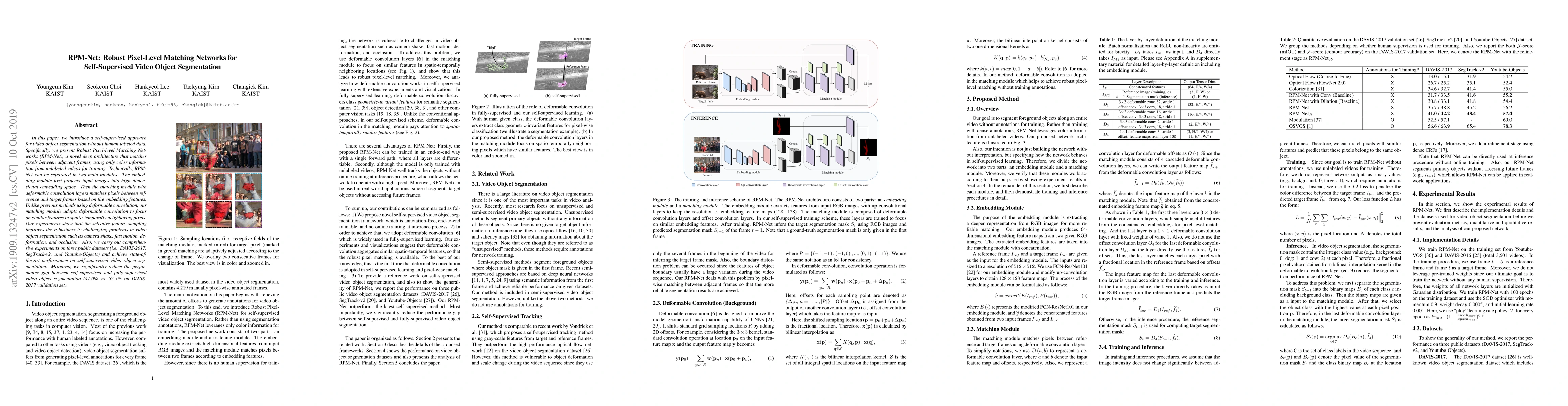 This paper introduces RPM-Net, a self-supervised deep learning architecture for video object segmentation using only unlabeled video data. It employs deformable convolution to match pixels between frames, achieving state-of-the-art performance on three datasets and significantly narrowing the gap between self-supervised and fully-supervised methods.