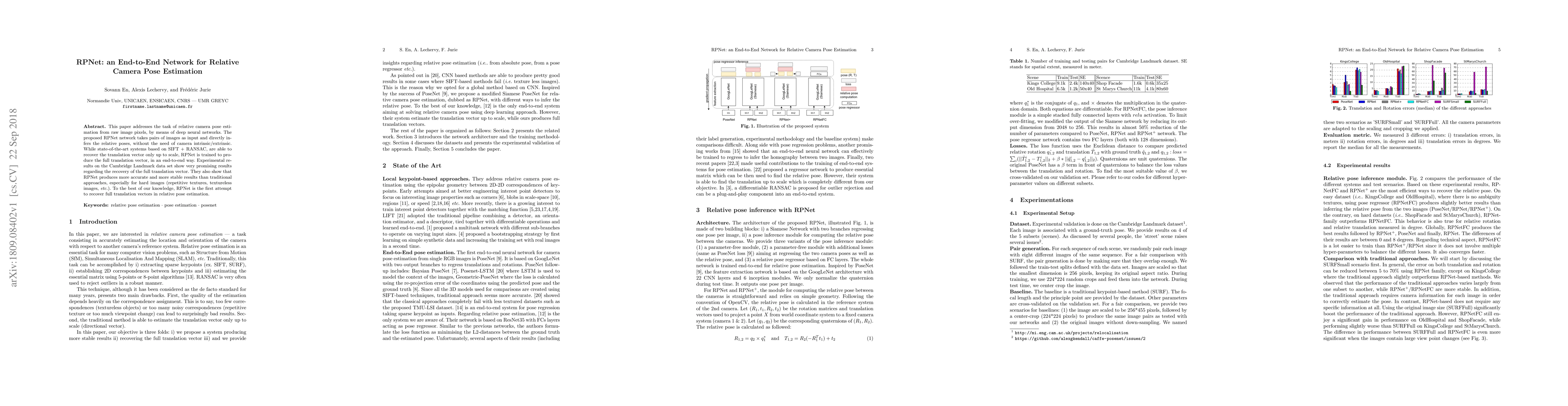 RPNet is a novel deep neural network for estimating relative camera poses from image pairs, directly inferring full translation vectors without requiring camera intrinsic/extrinsic parameters. It outperforms traditional methods like SIFT + RANSAC, especially in challenging conditions, as demonstrated by promising results on the Cambridge Landmark dataset.
