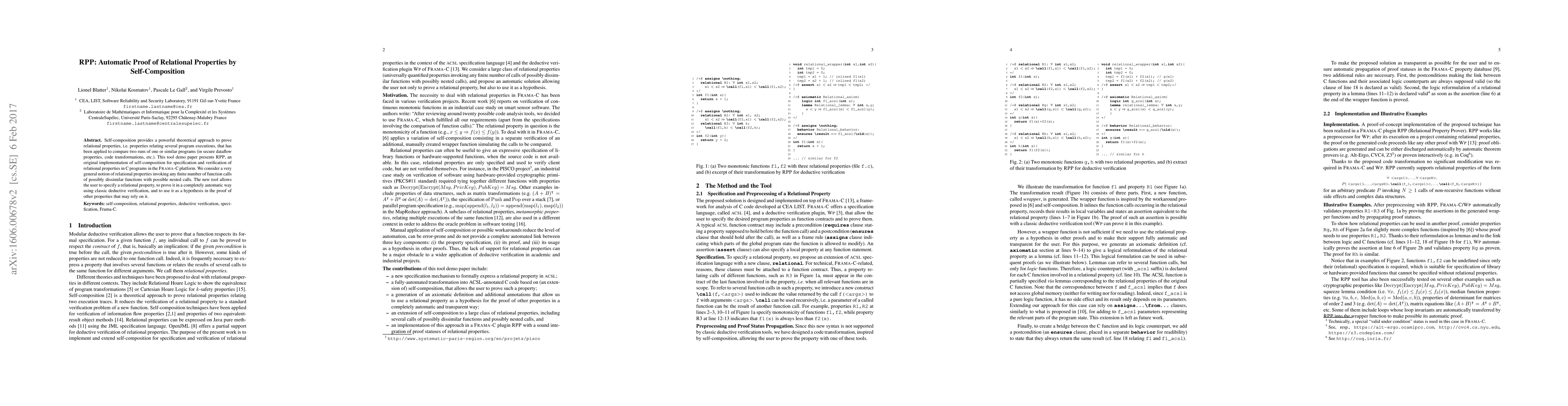 This paper introduces RPP, a tool for automatically proving relational properties in C programs using self-composition within the FRAMA-C platform. It enables the specification and verification of properties involving multiple function calls, facilitating automatic deductive proof and the use of proven properties as hypotheses in further proofs.