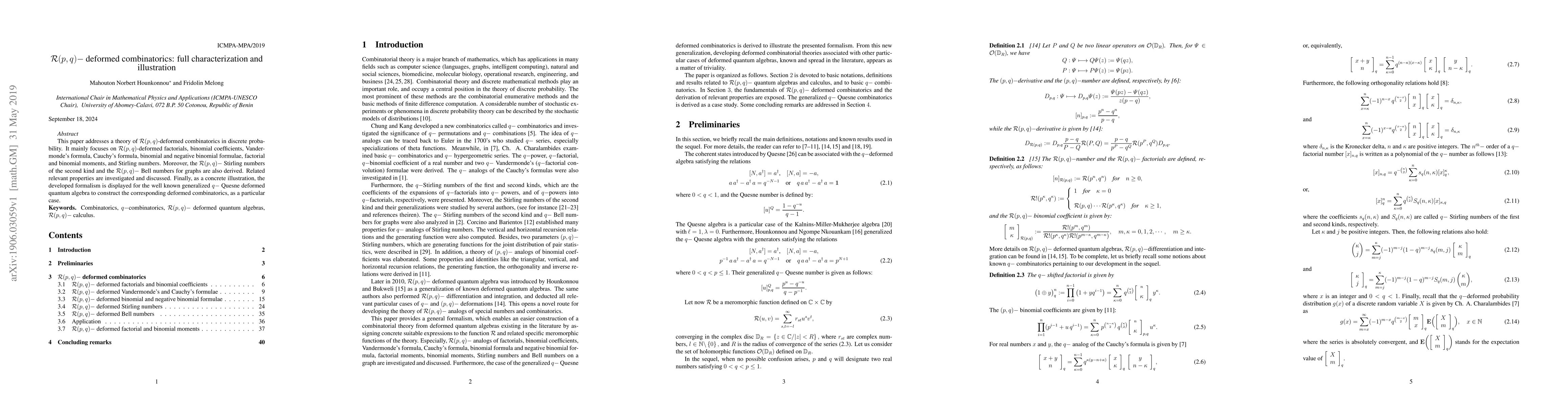 This paper fully characterizes R(p,q)-deformed combinatorics, detailing R(p,q)-deformed factorials, binomial coefficients, and various combinatorial formulas, and also introduces R(p,q)-Stirling numbers and R(p,q)-Bell numbers. It concludes with an application to generalized q-Quesne deformed quantum algebra.