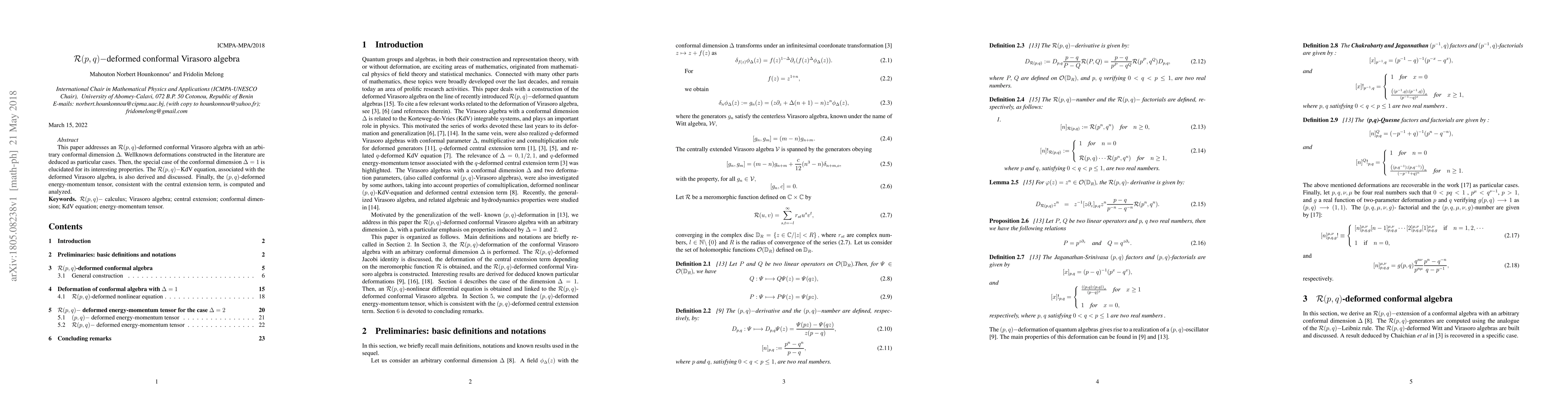 This paper addresses an R(p,q)-deformed conformal Virasoro algebra with an arbitrary conformal dimension Delta. Wellknown deformations constructed in the literature are deduced as particular cases. Then, the special case of the conformal dimension Delta=1 is elucidated for its interesting properties. The R(p,q)-KdV equation, associated with the deformed Virasoro algebra, is also derived and discussed. Finally, the (p,q)-deformed energy-momentum tensor, consistent with the central extension term, is computed and analyzed.