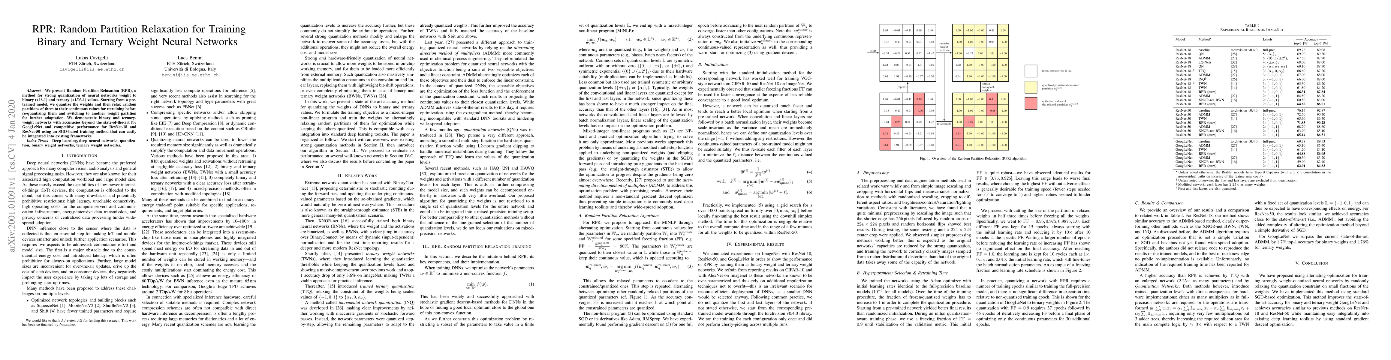 The paper introduces Random Partition Relaxation (RPR), a technique for quantizing neural network weights to binary or ternary values, followed by retraining through relaxation of random partitions to continuous values. This method achieves state-of-the-art accuracy for binary and competitive performance for ternary weights in networks like GoogLeNet, ResNet-18, and ResNet-50.