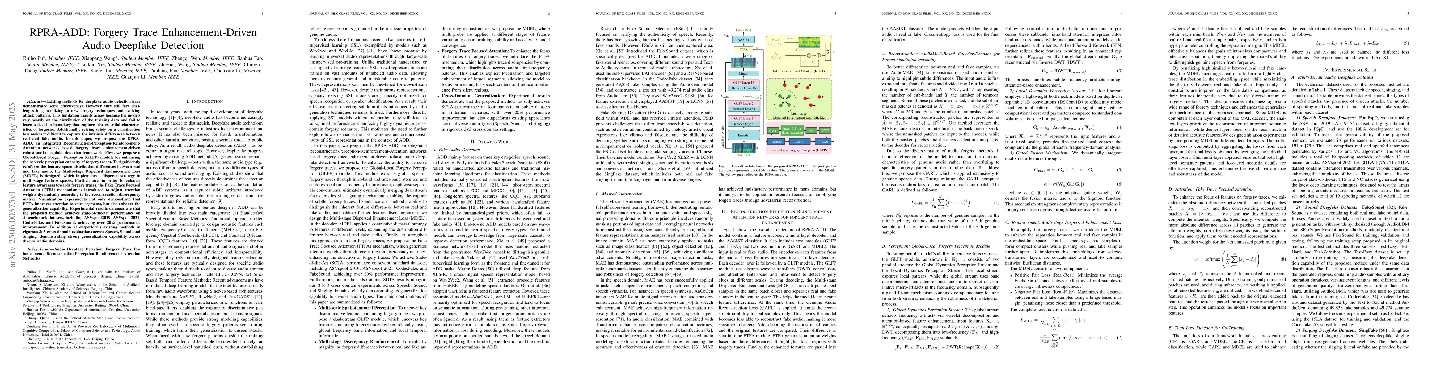 The proposed RPRA-ADD framework integrates Reconstruction-Perception-Reinforcement-Attention networks, incorporating a Global-Local Forgery Perception (GLFP) module, Multi-stage Dispersed Enhancement Loss (MDEL), and Fake Trace Focused Attention (FTFA) mechanism for robust audio deepfake detection.