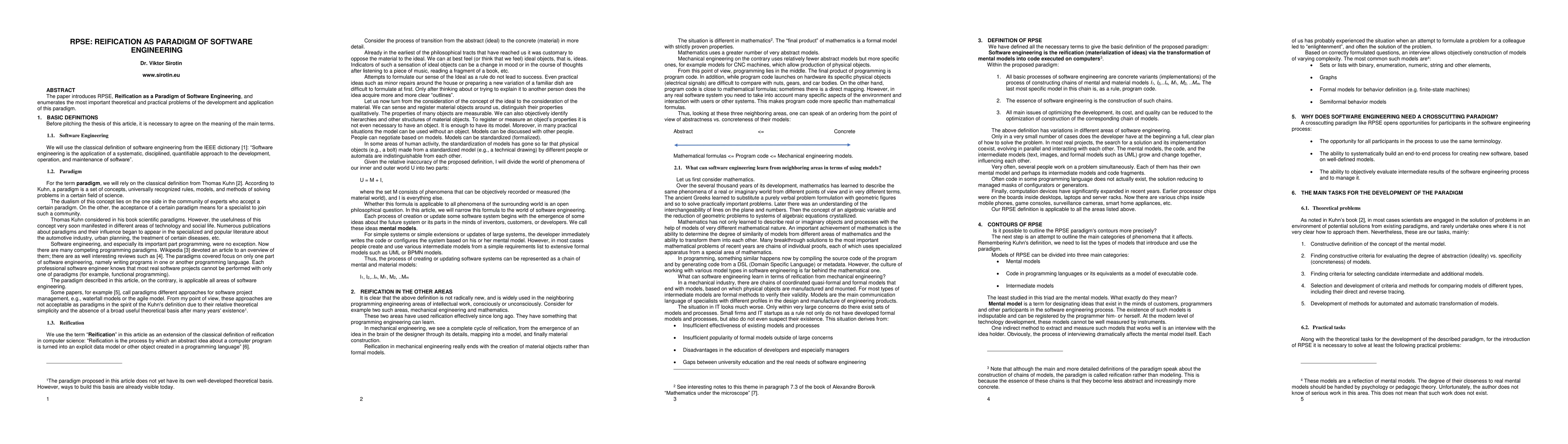 The paper introduces RPSE, Reification as a Paradigm of Software Engineering, and enumerates the most important theoretical and practical problems of the development and application of this paradigm. Main thesis: Software engineering is the reification (materialization of ideas) via the transformation of mental models into code executed on computers . Within the proposed paradigm: 1.All basic processes of software engineering are concrete variants (implementations) of the process of constructing chains of mental and material models I1, I2,..In, M1, M2, ..Mm. The last most specific model in this chain is, as a rule, program code. 2.The essence of software engineering is the construction of such chains. 3.All main issues of optimizing the development, its cost, and quality can be reduced to the optimization of construction of the corresponding chain of models.