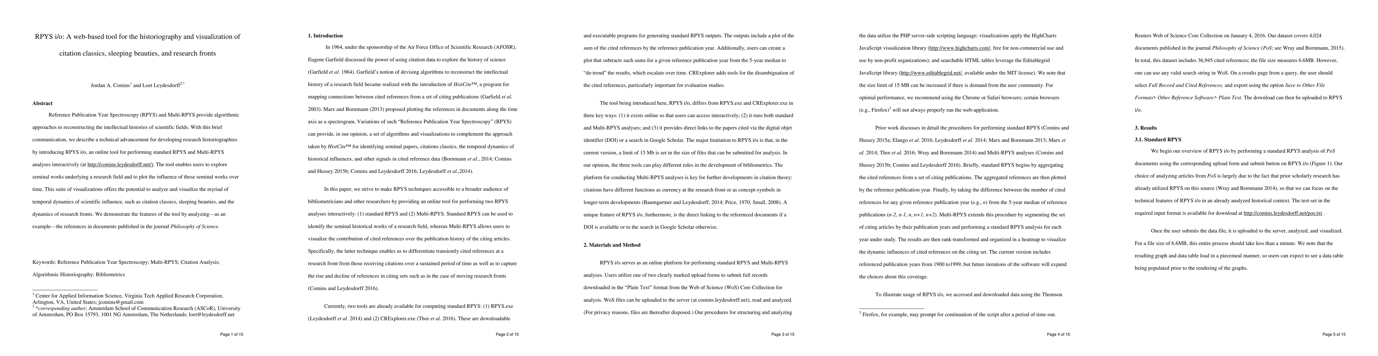 RPYS i/o is a web-based tool for interactively performing Reference Publication Year Spectroscopy analyses to visualize scientific influence over time, including citation classics and research fronts. It reconstructs the intellectual histories of scientific fields and demonstrates its utility by analyzing references from the journal Philosophy of Science.