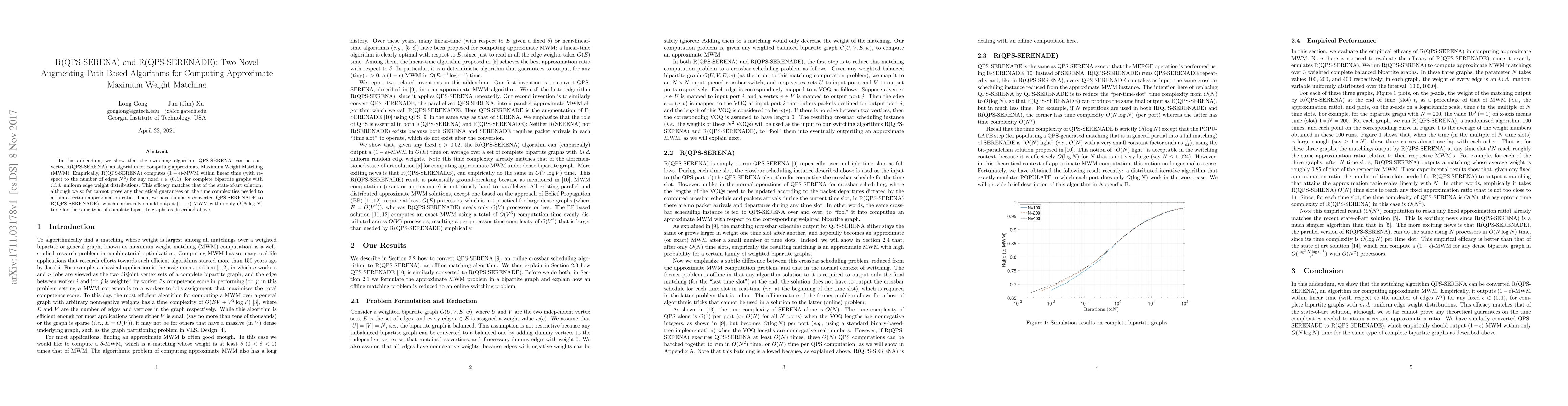 In this addendum, we show that the switching algorithm QPS-SERENA can be converted R(QPS-SERENA), an algorithm for computing approximate Maximum Weight Matching (MWM). Empirically, R(QPS-SERENA) computes $(1-\epsilon)$-MWM within linear time (with respect to the number of edges $N^2$) for any fixed $\epsilon\in (0,1)$, for complete bipartite graphs with {\it i.i.d.} uniform edge weight distributions. This efficacy matches that of the state-of-art solution, although we so far cannot prove any theoretical guarantees on the time complexities needed to attain a certain approximation ratio. Then, we have similarly converted QPS-SERENADE to R(QPS-SERENADE), which empirically should output $(1-\epsilon)$-MWM within only $O(N \log N)$ time for the same type of complete bipartite graphs as described above.