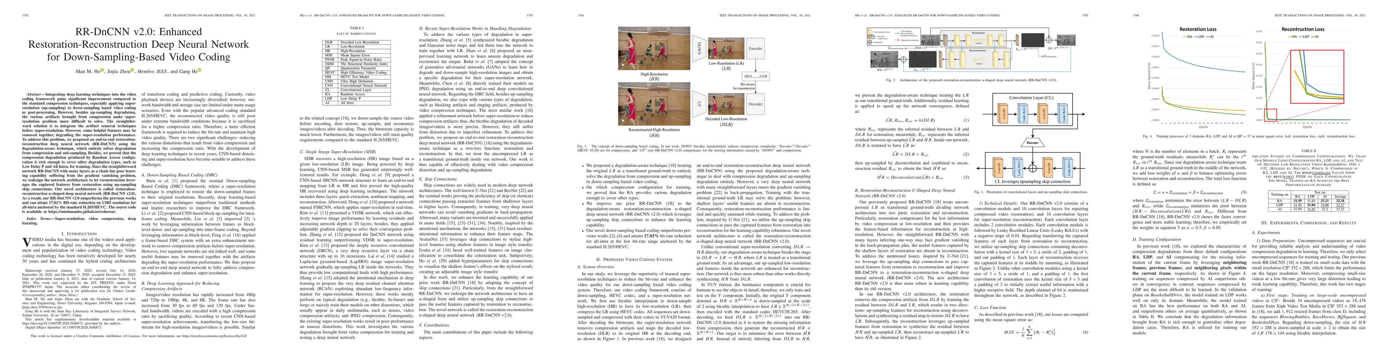 The paper proposes RR-DnCNN v2.0, an enhanced restoration-reconstruction deep neural network for down-sampling based video coding, which integrates degradation-aware techniques to address both compression and sub-sampling artifacts. The redesigned u-shaped network architecture with up-sampling skip connections significantly improves learning capability and achieves a 17.02% BD-rate reduction on UHD resolution compared to H.265/HEVC.